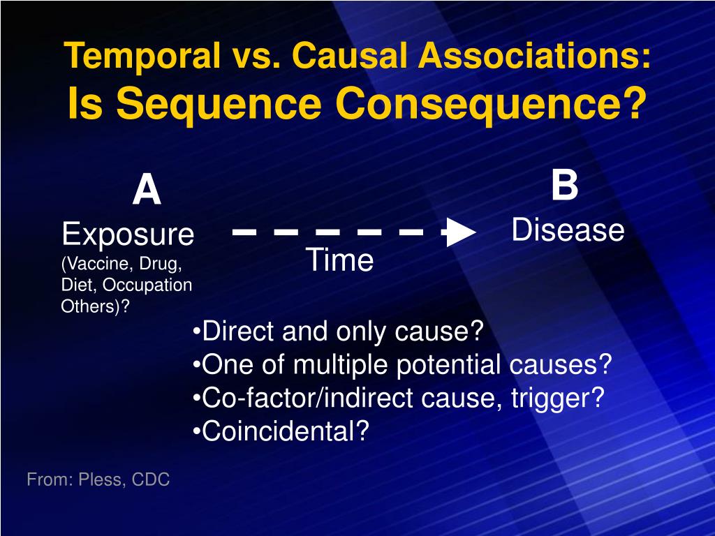 Temporal vs. Causal Associations:Is Sequence Consequence? B Disease A Exposure (Vaccine, Drug, Diet, Occupation Others)? Time • Direct and only cause? • One of multiple potential causes? • Co-factor/indirect cause, trigger? • Coincidental? From: Pless, CDC