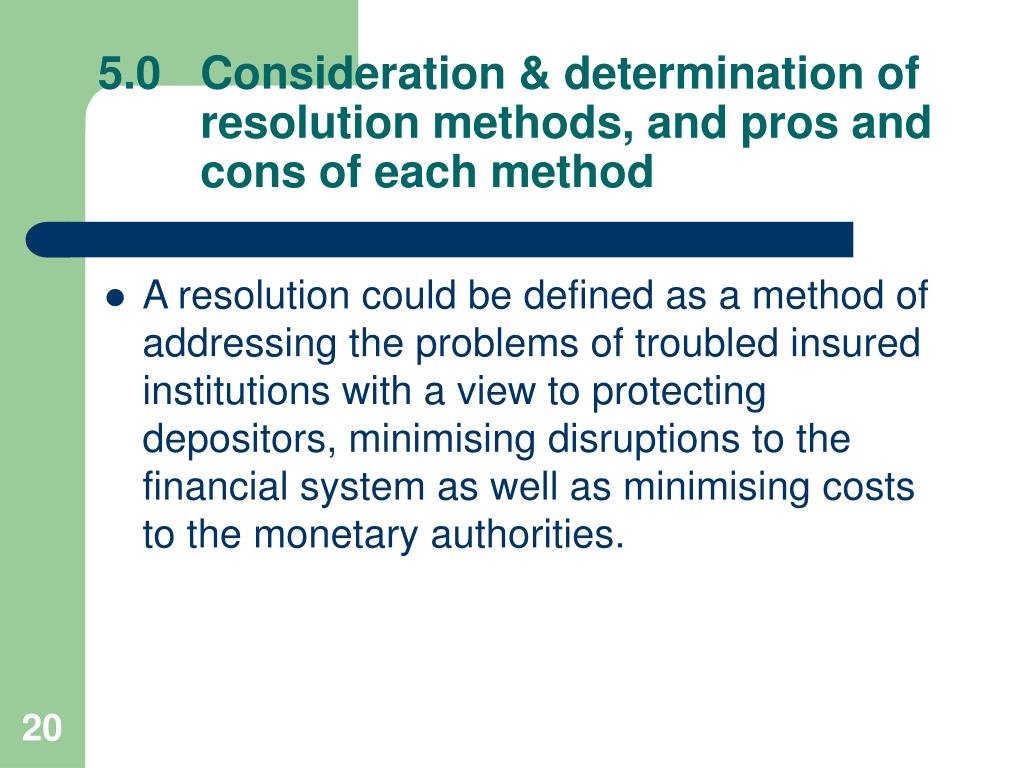 5.0 Consideration & determination of resolution methods, and pros and cons of each method • A resolution could be defined as a method of addressing the problems of troubled insured institutions with a view to protecting depositors, minimising disruptions to the financial system as well as minimising costs to the monetary authorities.