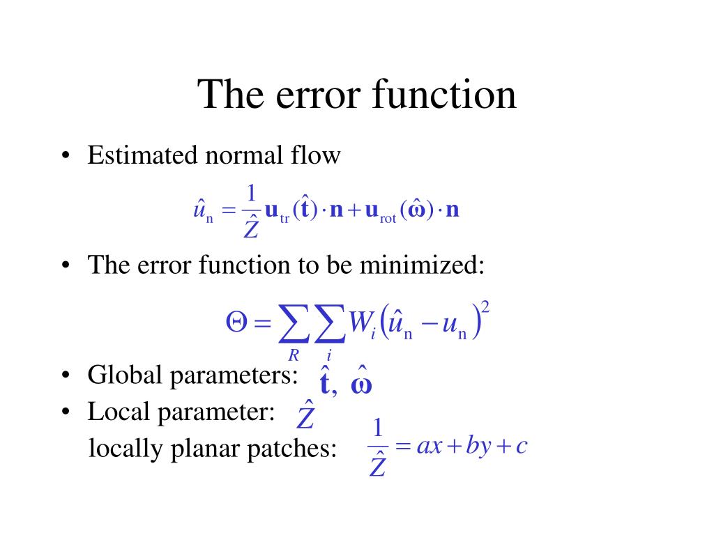 The error function • Estimated normal flow • The error function to be minimized: • Global parameters: • Local parameter: locally planar patches:
