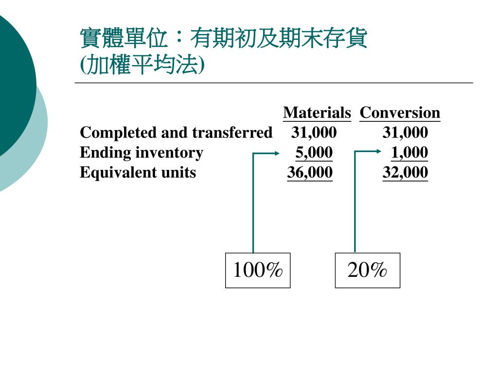 實體單位︰有期初及期末存貨(加權平均法) MaterialsConversion Completed and transferred 31,000 31,000 Ending inventory 5,0001,000 Equivalent units 36,00032,000 100% 20%