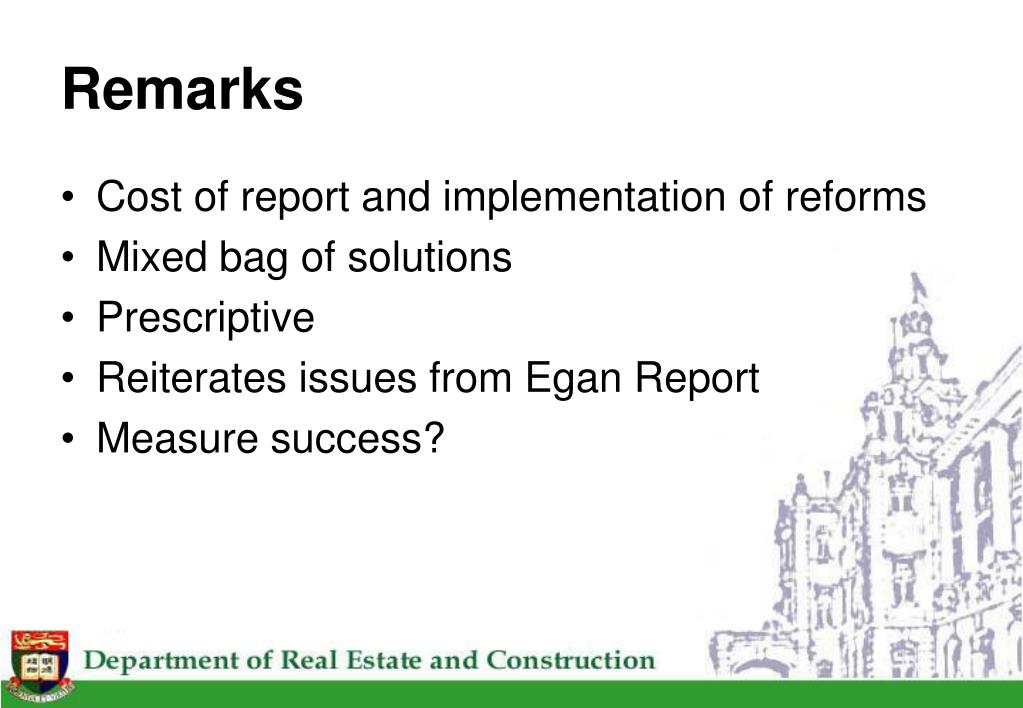 Remarks • Cost of report and implementation of reforms • Mixed bag of solutions • Prescriptive • Reiterates issues from Egan Report • Measure success?