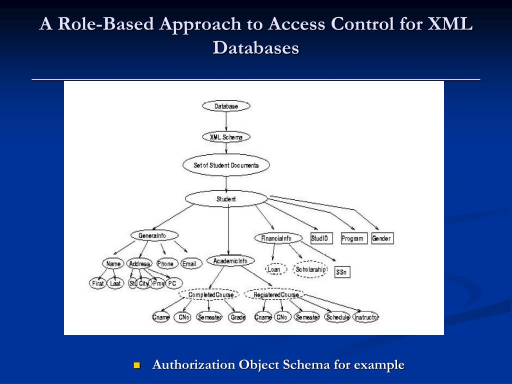 A Role-Based Approach to Access Control for XML Databases _____________________________________________ • Authorization Object Schema for example