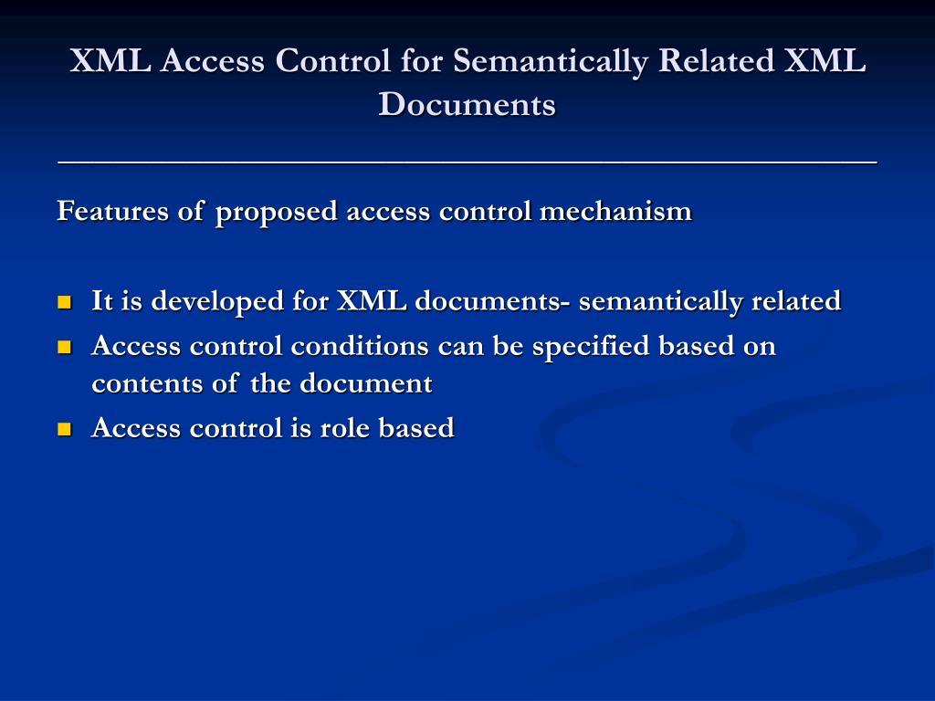 XML Access Control for Semantically Related XML Documents _____________________________________________ Features of proposed access control mechanism • It is developed for XML documents- semantically related • Access control conditions can be specified based on contents of the document • Access control is role based