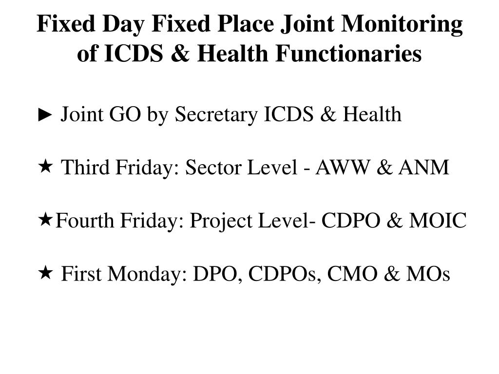 Fixed Day Fixed Place Joint Monitoring of ICDS & Health Functionaries • ► Joint GO by Secretary ICDS & Health • Third Friday: Sector Level - AWW & ANM • Fourth Friday: Project Level- CDPO & MOIC • First Monday: DPO, CDPOs, CMO & MOs