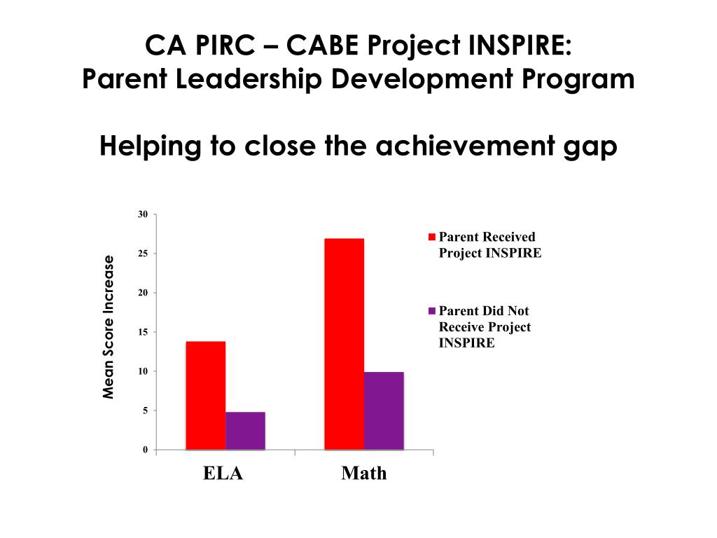CA PIRC – CABE Project INSPIRE: Parent Leadership Development Program Helping to close the achievement gap Mean Score Increase