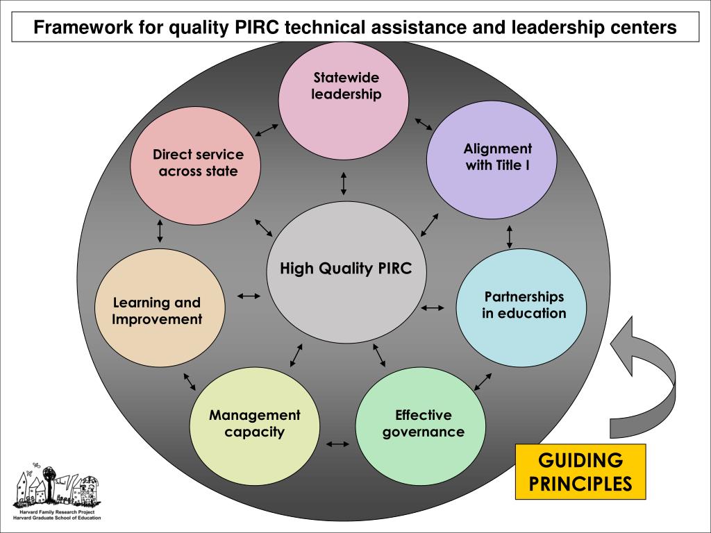 Framework for quality PIRC technical assistance and leadership centers Statewide leadership Alignment with Title I Direct service across state High Quality PIRC High Quality PIRC Partnerships in education Learning and Improvement Management capacity Effective governance GUIDING PRINCIPLES