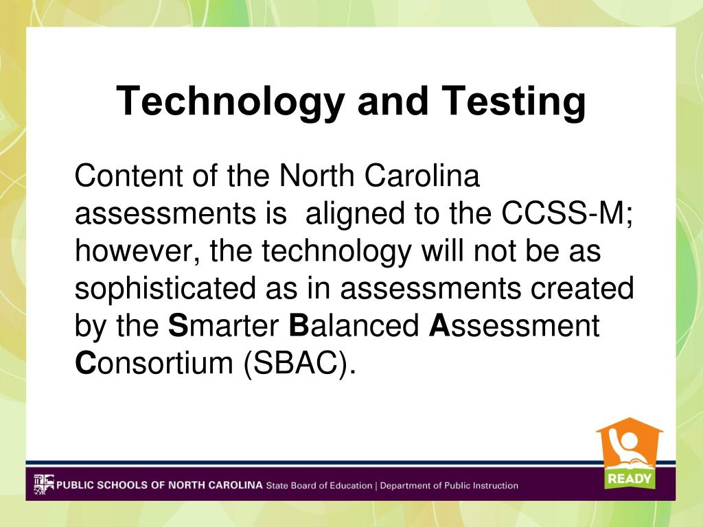Technology and Testing Content of the North Carolina assessments is aligned to the CCSS-M; however, the technology will not be as sophisticated as in assessments created by the Smarter Balanced Assessment Consortium (SBAC).