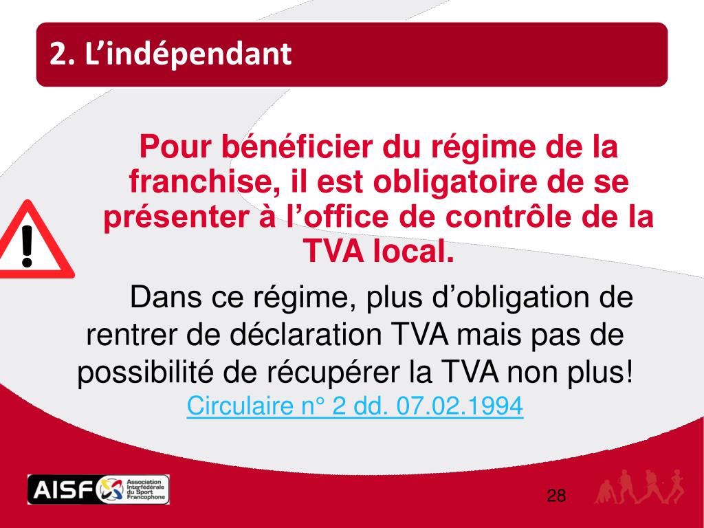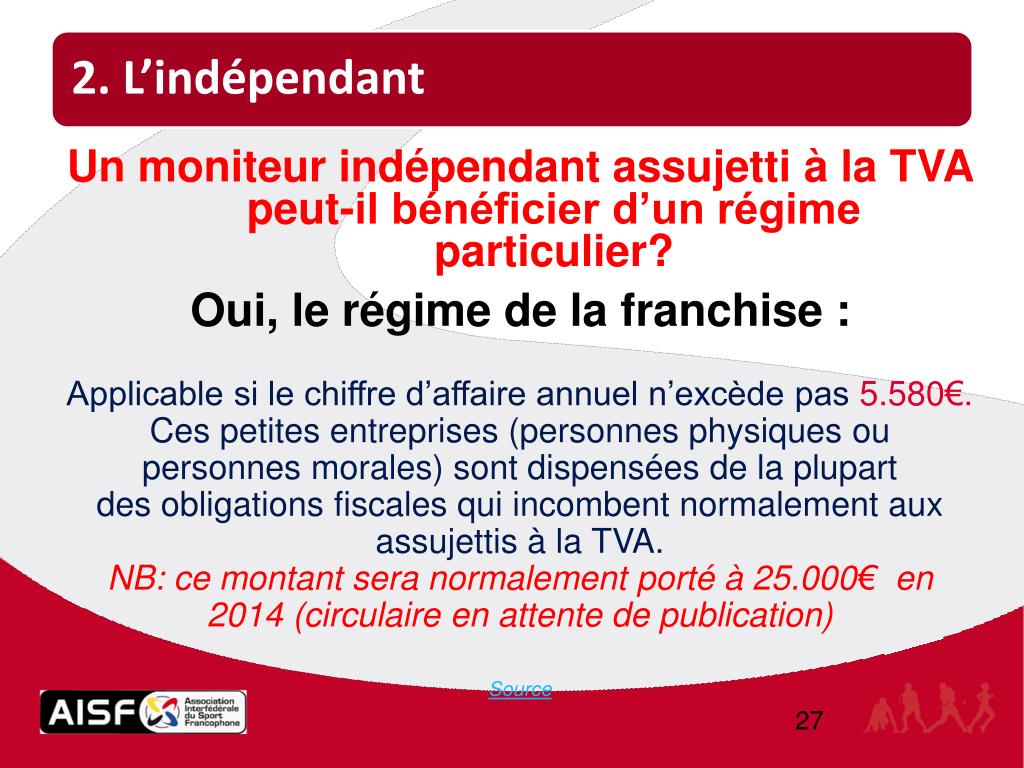 Un moniteur indépendant assujetti à la TVA peut-il bénéficier d’un régime particulier? Oui, le régime de la franchise :Applicable si le chiffre d’affaire annuel n’excède pas 5.580€.Ces petites entreprises (personnes physiques ou personnes morales) sont dispensées de la plupart des obligations fiscales qui incombent normalement aux assujettis à la TVA.NB: ce montant sera normalement porté à 25.000€ en 2014 (circulaire en attente de publication) Source