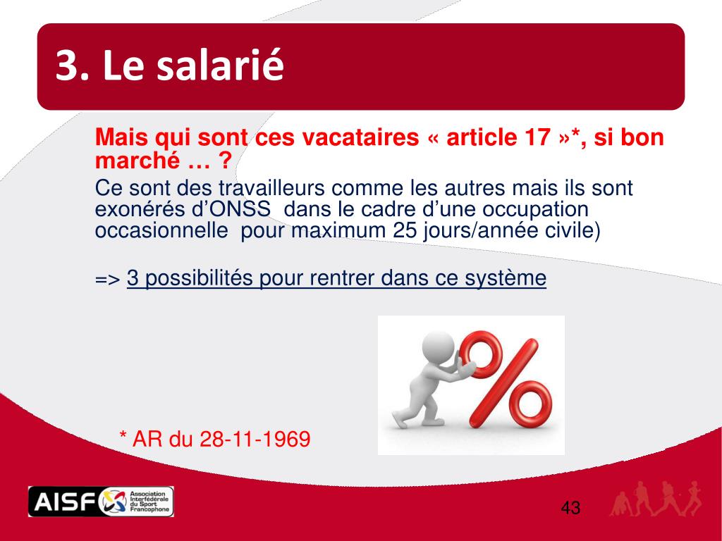 Certains clubs préfèrent engager sous contrat étudiant ou en tant que « vacataires art.17 » Pourquoi? Ce choix est liée au coût du travailleur car, pour un employé « classique », il faut ajouter environ 34% de cotisations à l’ONSS sauf : Pour un contrat d’étudiant : 5,42 % Pour un emploi APE ou ACS (0,56%) Pour un vacataire exonéré (art.17): 0%