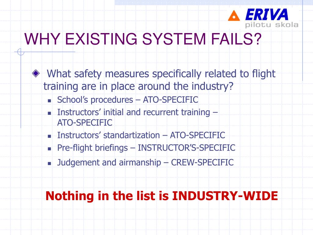 WHY EXISTING SYSTEM FAILS? • What safety measures specifically related to flight training are in place around the industry? • School’s procedures – ATO-SPECIFIC • Instructors’ initial and recurrent training – ATO-SPECIFIC • Instructors’ standartization – ATO-SPECIFIC • Pre-flight briefings – INSTRUCTOR’S-SPECIFIC • Judgement and airmanship – CREW-SPECIFIC Nothing in the list is INDUSTRY-WIDE