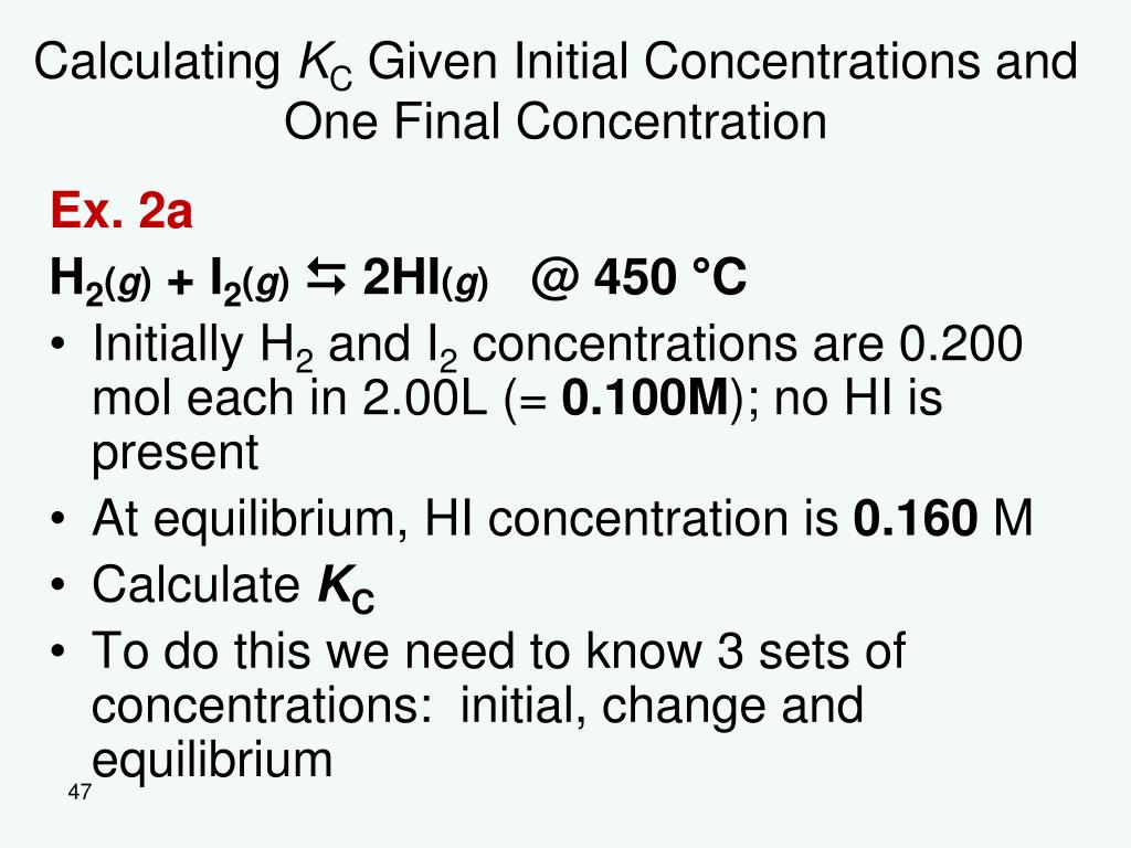 Calculating KC Given Initial Concentrations and One Final Concentration Ex. 2a H2(g) + I2(g) 2HI(g)@ 450 °C • Initially H2 and I2 concentrations are 0.200 mol each in 2.00L (= 0.100M); no HI is present • At equilibrium, HI concentration is 0.160 M • Calculate KC • To do this we need to know 3 sets of concentrations: initial, change and equilibrium