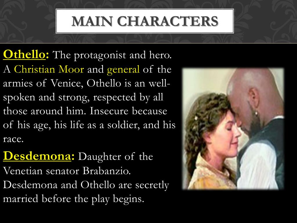 Main characters • Othello: The protagonist and hero. A Christian Moor and general of the armies of Venice, Othello is an well-spoken and strong, respected by all those around him. Insecure because of his age, his life as a soldier, and his race. • Desdemona: Daughter of the Venetian senator Brabanzio. Desdemona and Othello are secretly married before the play begins.