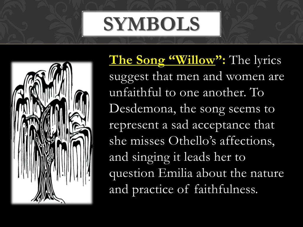 The Song “Willow”: The lyrics suggest that men and women are unfaithful to one another. To Desdemona, the song seems to represent a sad acceptance that she misses Othello’s affections, and singing it leads her to question Emilia about the nature and practice of faithfulness.
