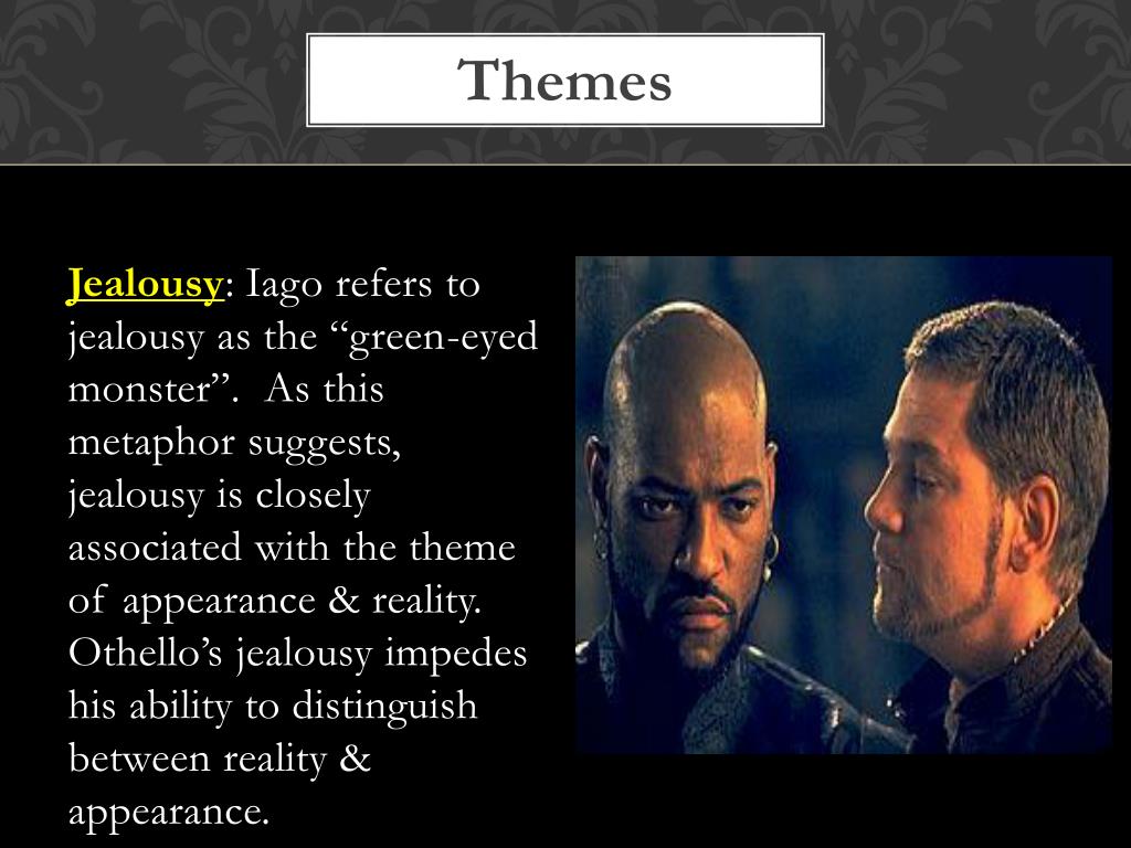 Jealousy:Iago refers to jealousy as the “green-eyed monster”. As this metaphor suggests, jealousy is closely associated with the theme of appearance & reality. Othello’s jealousy impedes his ability to distinguish between reality & appearance. Themes