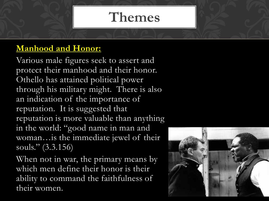 Manhood and Honor: Various male figures seek to assert and protect their manhood and their honor. Othello has attained political power through his military might. There is also an indication of the importance of reputation. It is suggested that reputation is more valuable than anything in the world: “good name in man and woman…is the immediate jewel of their souls.” (3.3.156) When not in war, the primary means by which men define their honor is their ability to command the faithfulness of their women. Themes