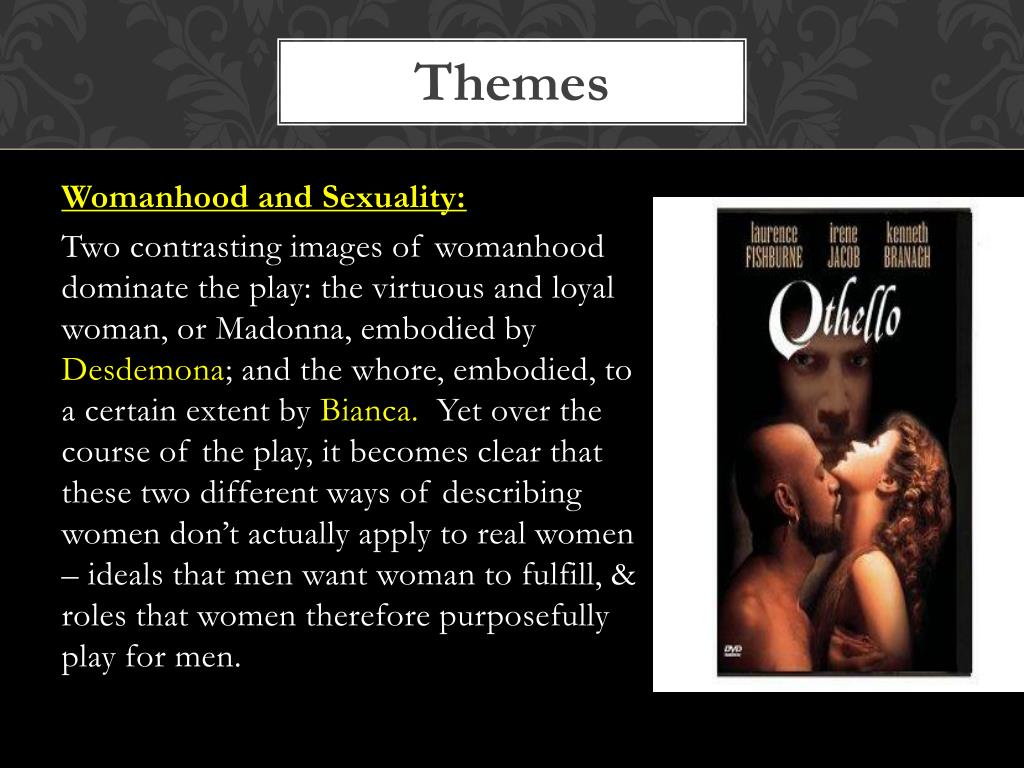 Womanhood and Sexuality: Two contrasting images of womanhood dominate the play: the virtuous and loyal woman, or Madonna, embodied by Desdemona; and the whore, embodied, to a certain extent by Bianca. Yet over the course of the play, it becomes clear that these two different ways of describing women don’t actually apply to real women – ideals that men want woman to fulfill, & roles that women therefore purposefully play for men. Themes
