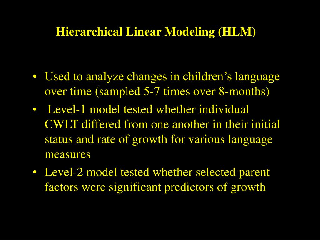Hierarchical Linear Modeling (HLM) • Used to analyze changes in children’s language over time (sampled 5-7 times over 8-months) • Level-1 model tested whether individual CWLT differed from one another in their initial status and rate of growth for various language measures • Level-2 model tested whether selected parent factors were significant predictors of growth