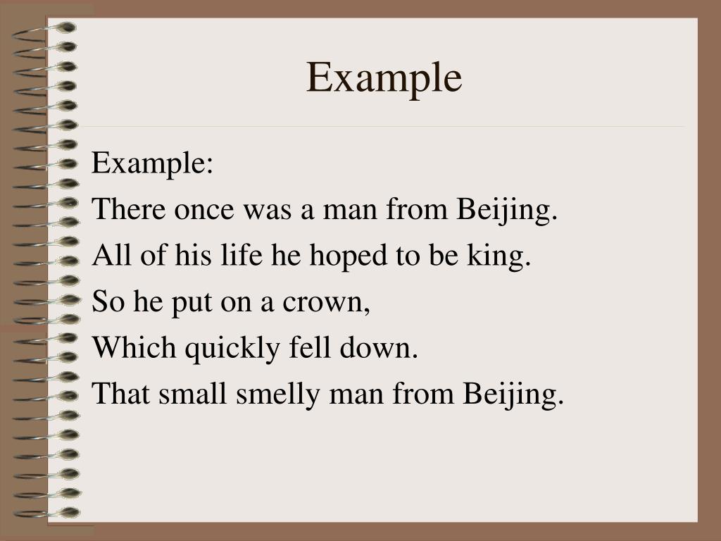 Example Example: There once was a man from Beijing. All of his life he hoped to be king. So he put on a crown, Which quickly fell down. That small smelly man from Beijing.