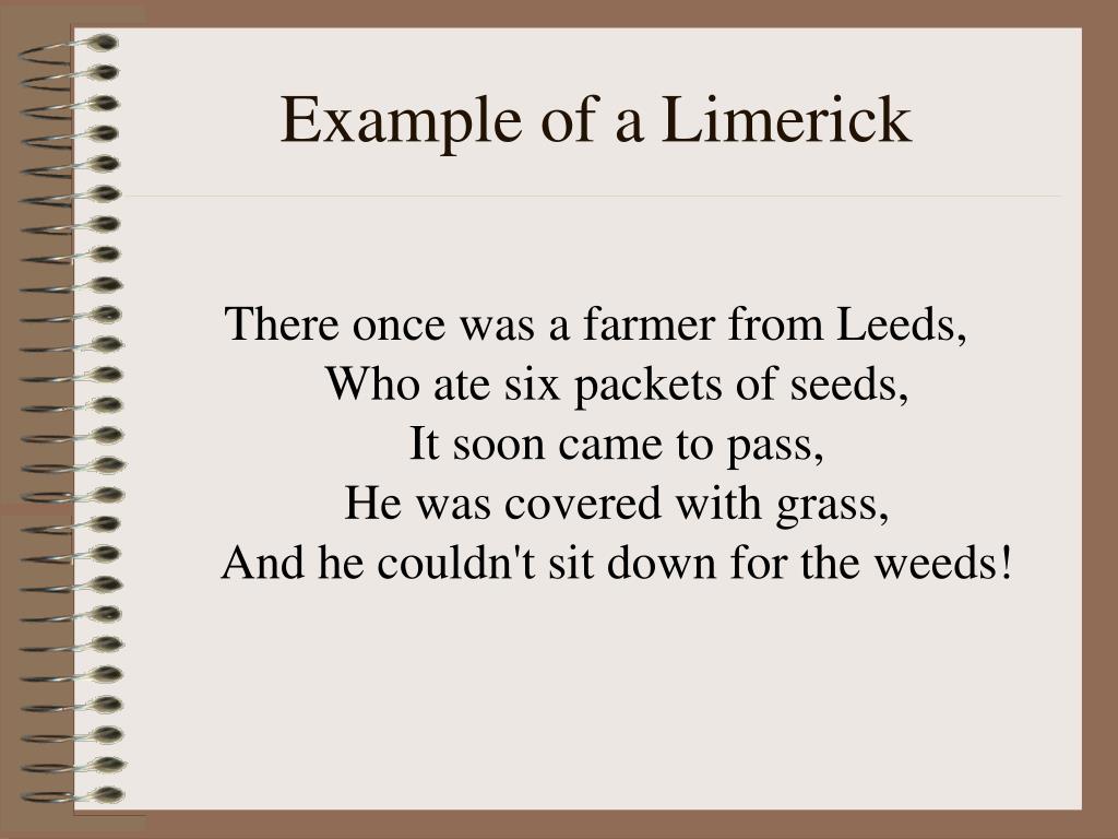 Example of a Limerick There once was a farmer from Leeds,Who ate six packets of seeds,It soon came to pass,He was covered with grass,And he couldn't sit down for the weeds!