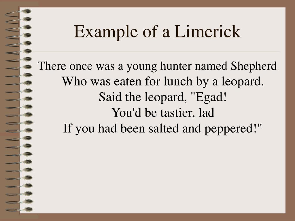 Example of a Limerick There once was a young hunter named ShepherdWho was eaten for lunch by a leopard.Said the leopard, "Egad!You'd be tastier, ladIf you had been salted and peppered!"