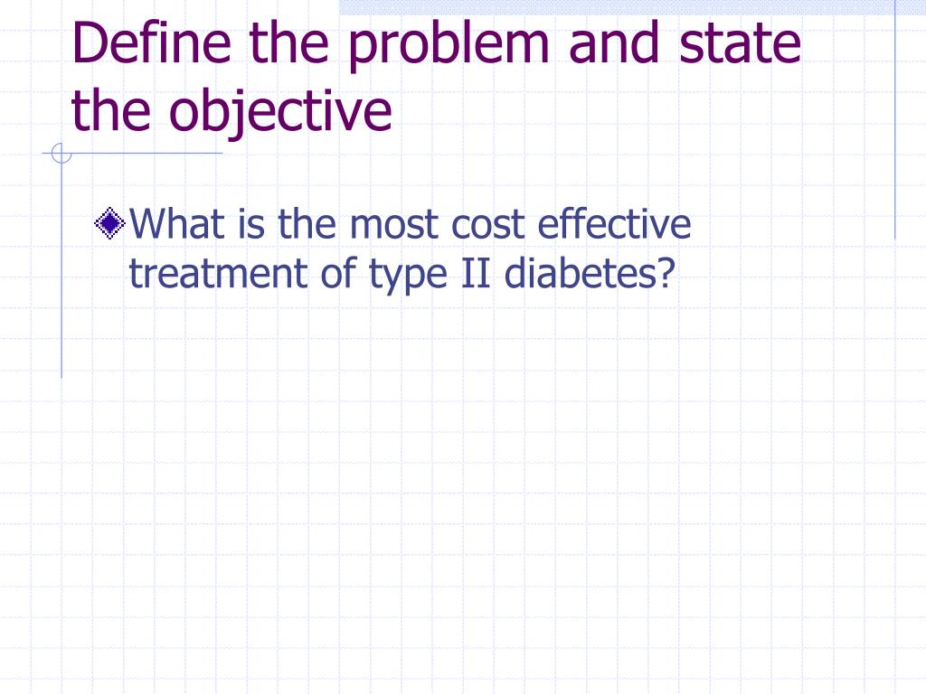 Define the problem and state the objective • What is the most cost effective treatment of type II diabetes?
