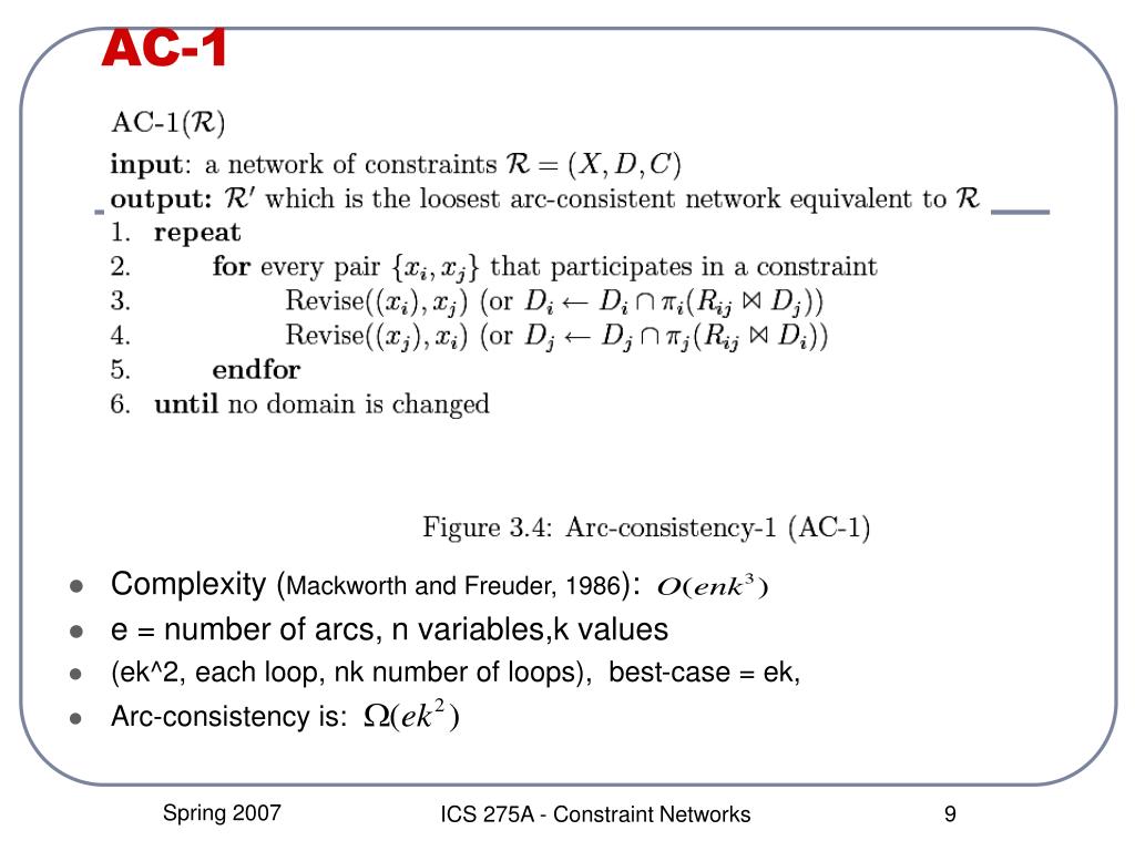 AC-1 • Complexity (Mackworth and Freuder, 1986): • e = number of arcs, n variables,k values • (ek^2, each loop, nk number of loops), best-case = ek, • Arc-consistency is: ICS 275A - Constraint Networks