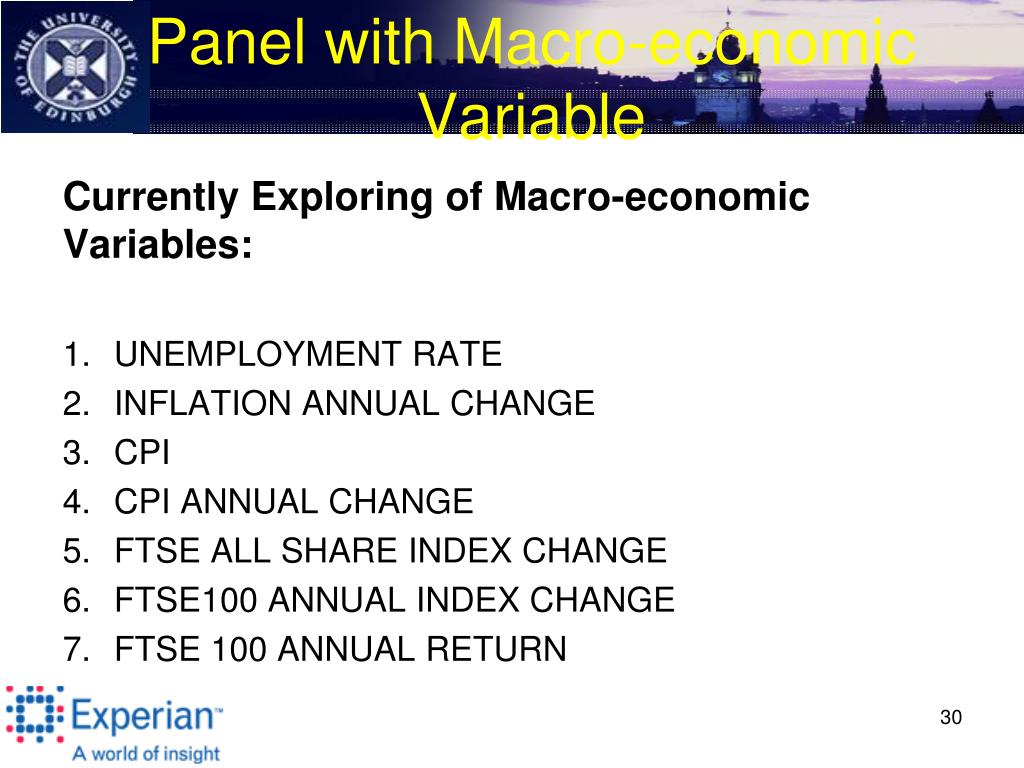 Panel with Macro-economic Variable Currently Exploring of Macro-economic Variables: • UNEMPLOYMENT RATE • INFLATION ANNUAL CHANGE • CPI • CPI ANNUAL CHANGE • FTSE ALL SHARE INDEX CHANGE • FTSE100 ANNUAL INDEX CHANGE • FTSE 100 ANNUAL RETURN