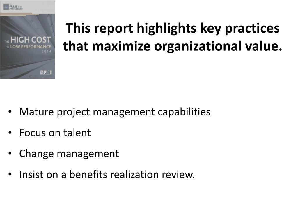 This report highlights key practices that maximize organizational value. • Mature project management capabilities • Focus on talent • Change management • Insist on a benefits realization review.