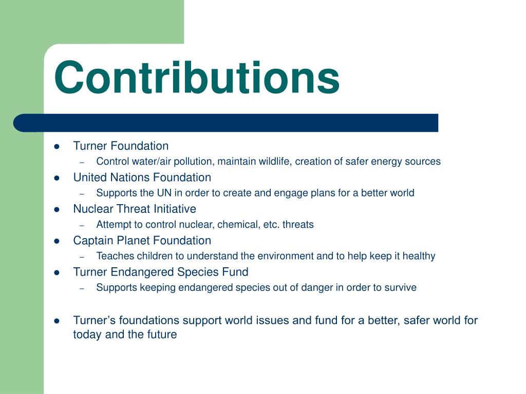 Contributions • Turner Foundation • Control water/air pollution, maintain wildlife, creation of safer energy sources • United Nations Foundation • Supports the UN in order to create and engage plans for a better world • Nuclear Threat Initiative • Attempt to control nuclear, chemical, etc. threats • Captain Planet Foundation • Teaches children to understand the environment and to help keep it healthy • Turner Endangered Species Fund • Supports keeping endangered species out of danger in order to survive • Turner’s foundations support world issues and fund for a better, safer world for today and the future