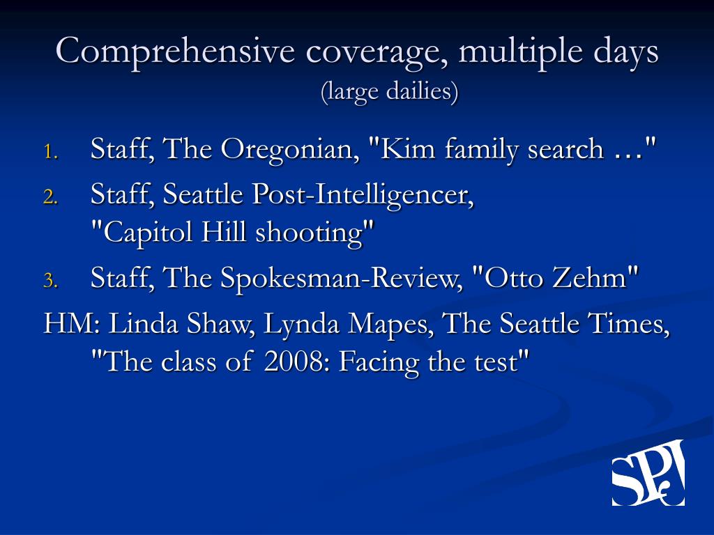 Comprehensive coverage, multiple days (large dailies) • Staff, The Oregonian, "Kim family search …" • Staff, Seattle Post-Intelligencer, "Capitol Hill shooting" • Staff, The Spokesman-Review, "Otto Zehm" HM: Linda Shaw, Lynda Mapes, The Seattle Times, "The class of 2008: Facing the test"