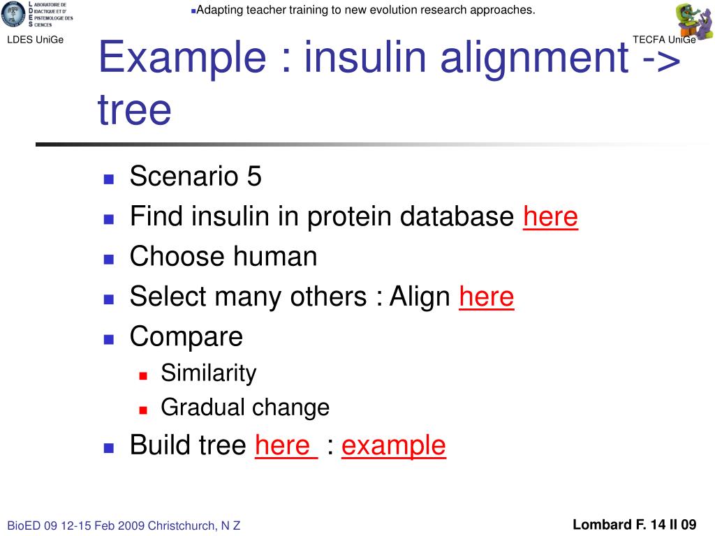 Example : insulin alignment -> tree • Scenario 5 • Find insulin in protein database here • Choose human • Select many others : Align here • Compare • Similarity • Gradual change • Build tree here : example Lombard F. 14 II 09