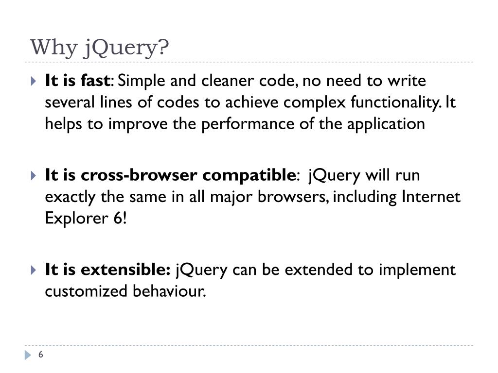 Why jQuery? • It is fast: Simple and cleaner code, no need to write several lines of codes to achieve complex functionality. It helps to improve the performance of the application • It is cross-browser compatible: jQuerywill run exactly the same in all major browsers, including Internet Explorer 6! • It is extensible:jQuery can be extended to implement customized behaviour.