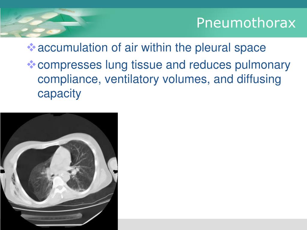 Pneumothorax • accumulation of air within the pleural space • compresses lung tissue and reduces pulmonary compliance, ventilatory volumes, and diffusing capacity