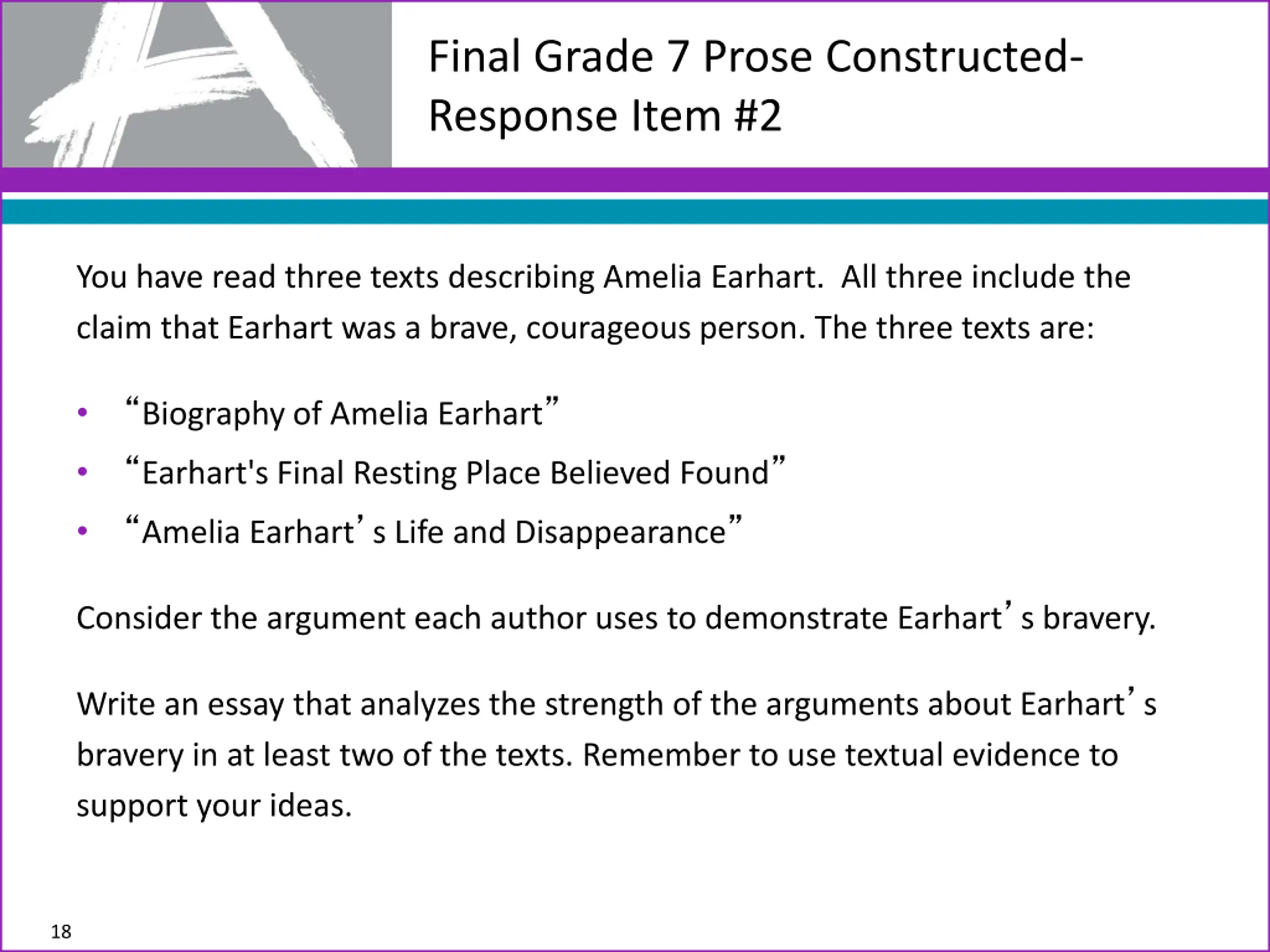Final Grade 7 Prose Constructed- Response Item #2 You have read three texts describing Amelia Earhart. All three include the claim that Earhart was a brave, courageous person. The three texts are: • “Biography of Amelia Earhart” • “Earhart's Final Resting Place Believed Found” • “Amelia Earhart’s Life and Disappearance” Consider the argument each author uses to demonstrate Earhart’s bravery. Write an essay that analyzes the strength of the arguments about Earhart’s bravery in at least two of the texts. Remember to use textual evidence to support your ideas. 18