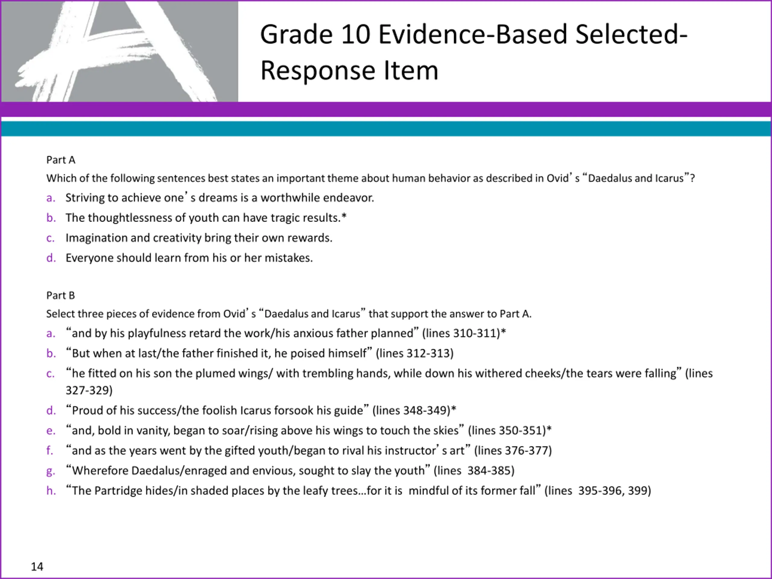 Grade 10 Evidence-Based Selected- Response Item Part A Which of the following sentences best states an important theme about human behavior as described in Ovid’s “Daedalus and Icarus”? a. Striving to achieve one’s dreams is a worthwhile endeavor. b. The thoughtlessness of youth can have tragic results.* c. Imagination and creativity bring their own rewards. d. Everyone should learn from his or her mistakes. Part B Select three pieces of evidence from Ovid’s “Daedalus and Icarus” that support the answer to Part A. a. “and by his playfulness retard the work/his anxious father planned”(lines 310-311)* b. “But when at last/the father finished it, he poised himself” (lines 312-313) c. “he fitted on his son the plumed wings/ with trembling hands, while down his withered cheeks/the tears were falling” (lines 327-329) d. “Proud of his success/the foolish Icarus forsook his guide” (lines 348-349)* e. “and, bold in vanity, began to soar/rising above his wings to touch the skies” (lines 350-351)* “and as the years went by the gifted youth/began to rival his instructor’s art” (lines 376-377) g. “Wherefore Daedalus/enraged and envious, sought to slay the youth” (lines 384-385) h. “The Partridge hides/in shaded places by the leafy trees…for it is mindful of its former fall” (lines 395-396, 399) f. 14