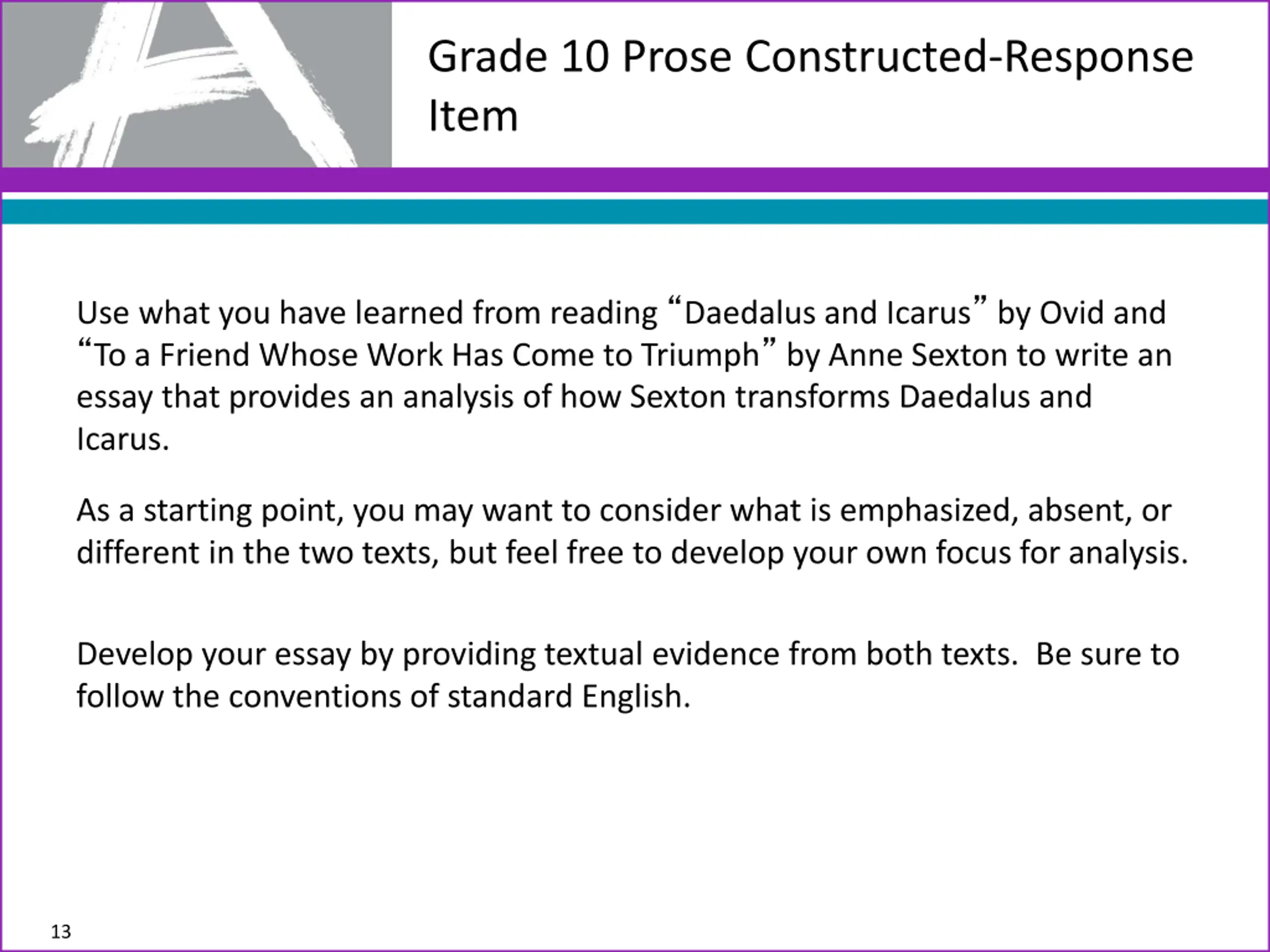 Grade 10 Prose Constructed-Response Item Use what you have learned from reading “Daedalus and Icarus” by Ovid and “To a Friend Whose Work Has Come to Triumph” by Anne Sexton to write an essay that provides an analysis of how Sexton transforms Daedalus and Icarus. As a starting point, you may want to consider what is emphasized, absent, or different in the two texts, but feel free to develop your own focus for analysis. Develop your essay by providing textual evidence from both texts. Be sure to follow the conventions of standard English. 13
