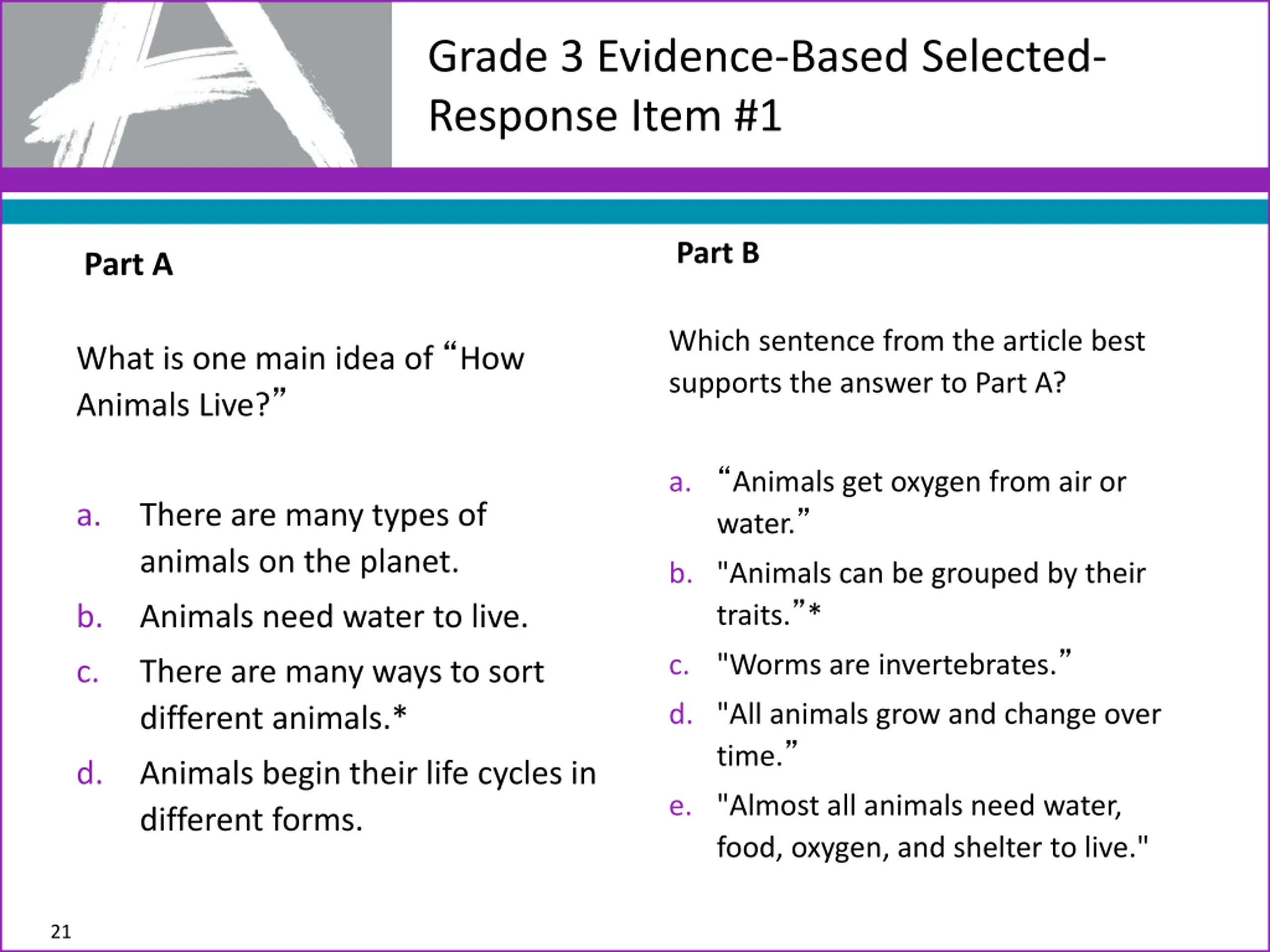 Grade 3 Evidence-Based Selected- Response Item #1 Part B Part A Which sentence from the article best supports the answer to Part A? What is one main idea of “How Animals Live?” a. “Animals get oxygen from air or water.” a. There are many types of animals on the planet. b. "Animals can be grouped by their traits.”* c. "Worms are invertebrates.” b. Animals need water to live. c. There are many ways to sort different animals.* d. "All animals grow and change over time.” d. Animals begin their life cycles in different forms. e. "Almost all animals need water, food, oxygen, and shelter to live." 21