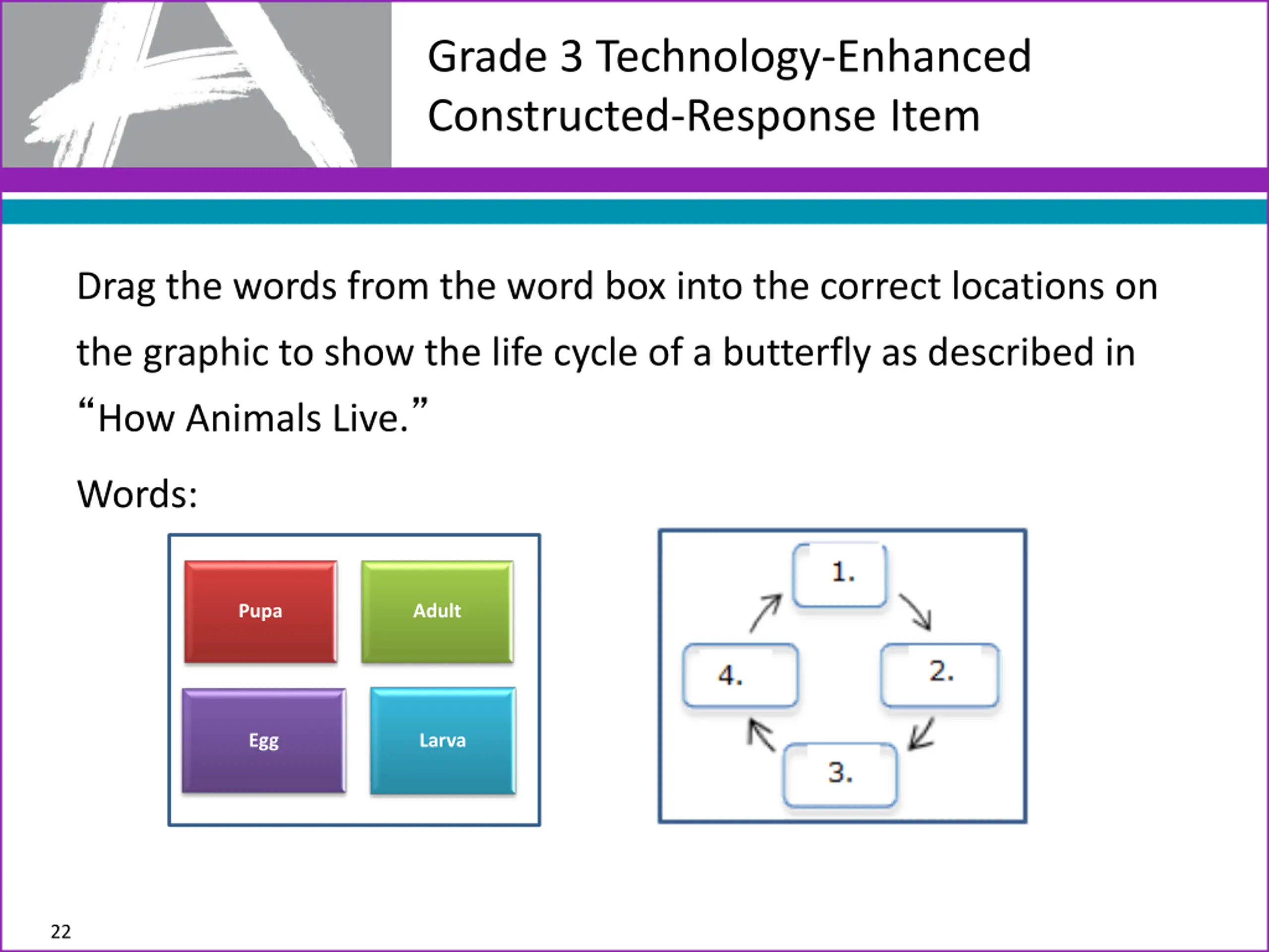 Grade 3 Technology-Enhanced Constructed-Response Item Drag the words from the word box into the correct locations on the graphic to show the life cycle of a butterfly as described in “How Animals Live.” Words: Pupa Adult Egg Larva 22