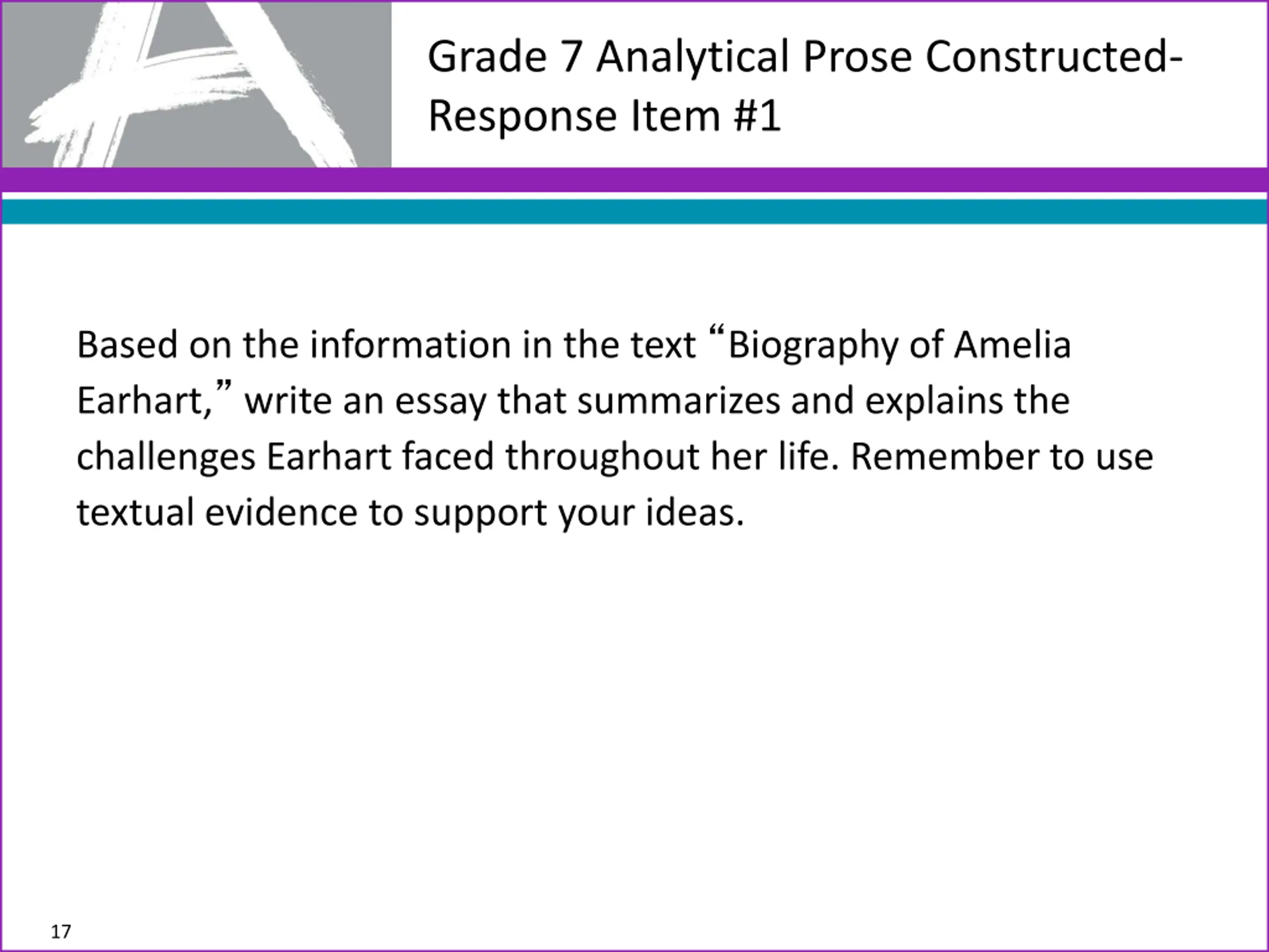 Grade 7 Analytical Prose Constructed- Response Item #1 Based on the information in the text “Biography of Amelia Earhart,” write an essay that summarizes and explains the challenges Earhart faced throughout her life. Remember to use textual evidence to support your ideas. 17