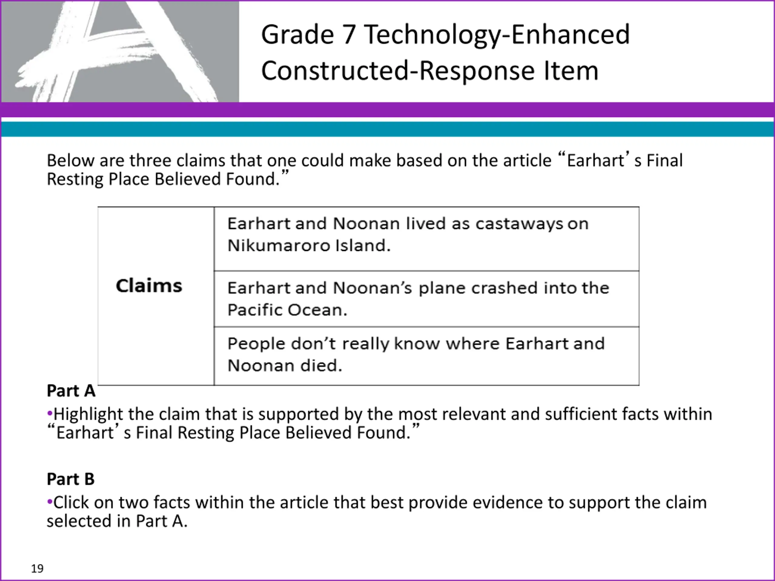 Grade 7 Technology-Enhanced Constructed-Response Item Below are three claims that one could make based on the article “Earhart’s Final Resting Place Believed Found.” Part A •Highlight the claim that is supported by the most relevant and sufficient facts within “Earhart’s Final Resting Place Believed Found.” Part B •Click on two facts within the article that best provide evidence to support the claim selected in Part A. 19