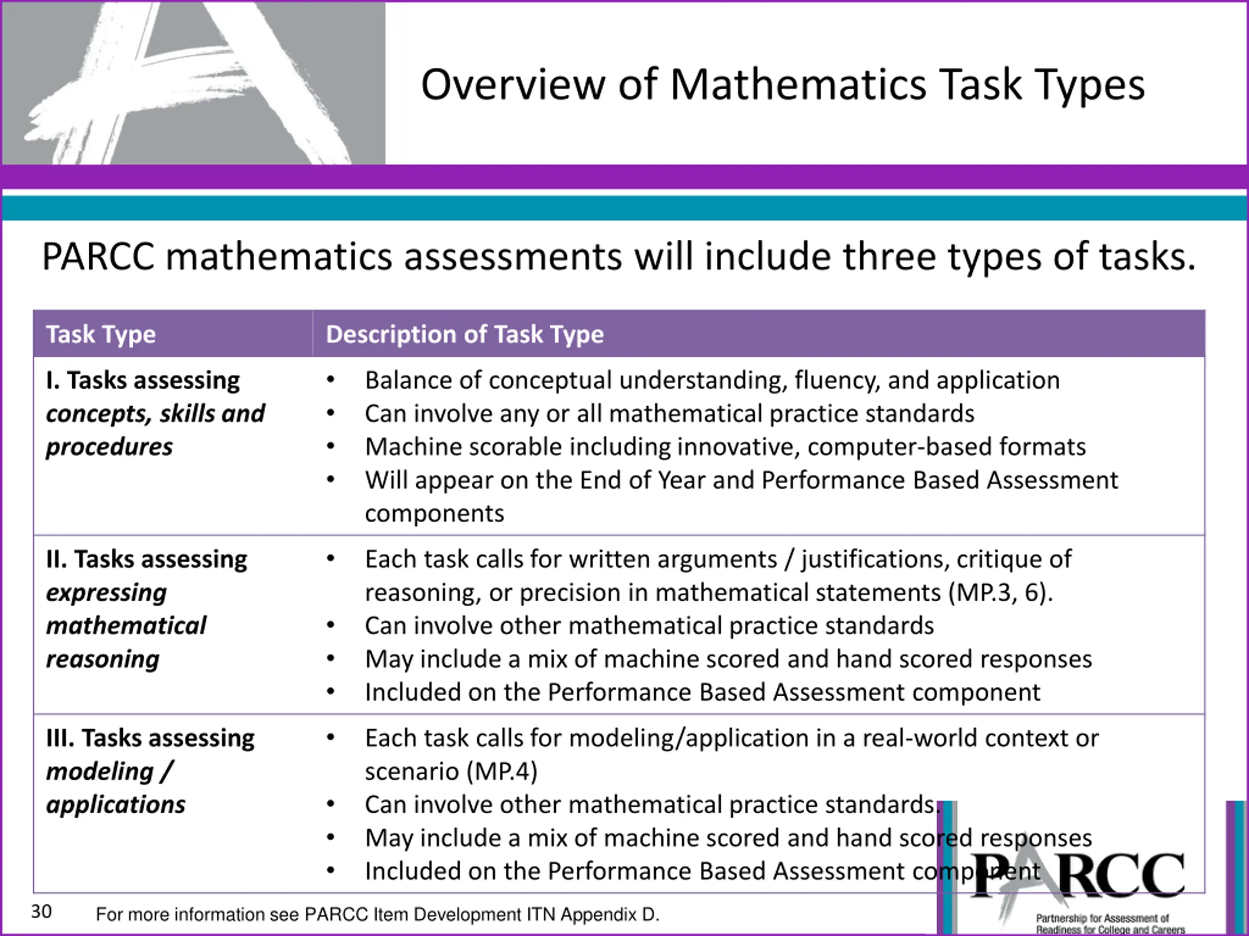 Overview of Mathematics Task Types PARCC mathematics assessments will include three types of tasks. Task Type Description of Task Type • • • • I. Tasks assessing concepts, skills and procedures Balance of conceptual understanding, fluency, and application Can involve any or all mathematical practice standards Machine scorable including innovative, computer-based formats Will appear on the End of Year and Performance Based Assessment components • II. Tasks assessing expressing mathematical reasoning Each task calls for written arguments / justifications, critique of reasoning, or precision in mathematical statements (MP.3, 6). Can involve other mathematical practice standards May include a mix of machine scored and hand scored responses Included on the Performance Based Assessment component • • • • III. Tasks assessing modeling / applications Each task calls for modeling/application in a real-world context or scenario (MP.4) Can involve other mathematical practice standards. May include a mix of machine scored and hand scored responses Included on the Performance Based Assessment component • • • 30 For more information see PARCC Item Development ITN Appendix D.