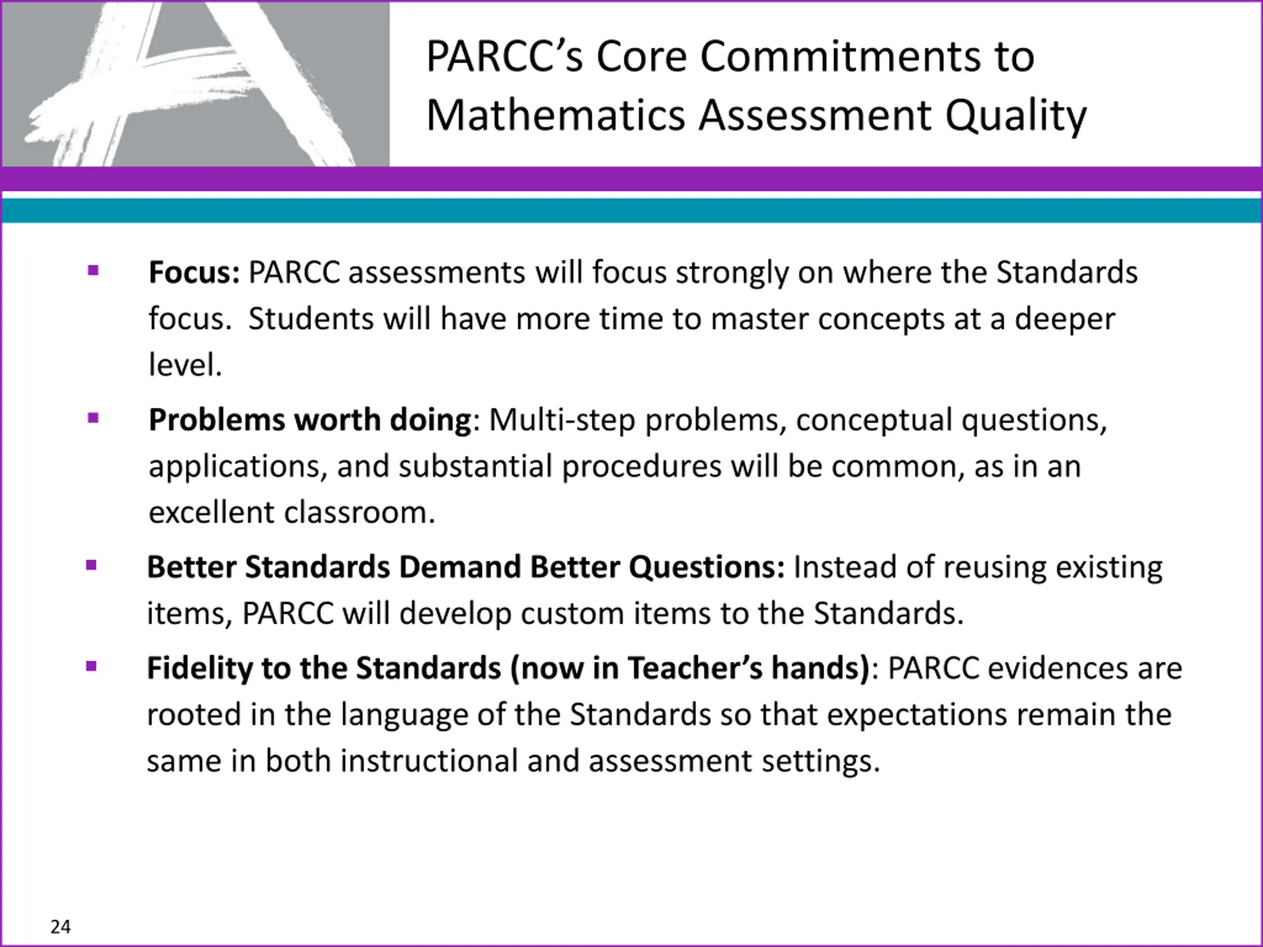 PARCC’s Core Commitments to Mathematics Assessment Quality Focus: PARCC assessments will focus strongly on where the Standards focus. Students will have more time to master concepts at a deeper level. Problems worth doing: Multi-step problems, conceptual questions, applications, and substantial procedures will be common, as in an excellent classroom. Better Standards Demand Better Questions: Instead of reusing existing items, PARCC will develop custom items to the Standards. Fidelity to the Standards (now in Teacher’s hands): PARCC evidences are rooted in the language of the Standards so that expectations remain the same in both instructional and assessment settings. 24