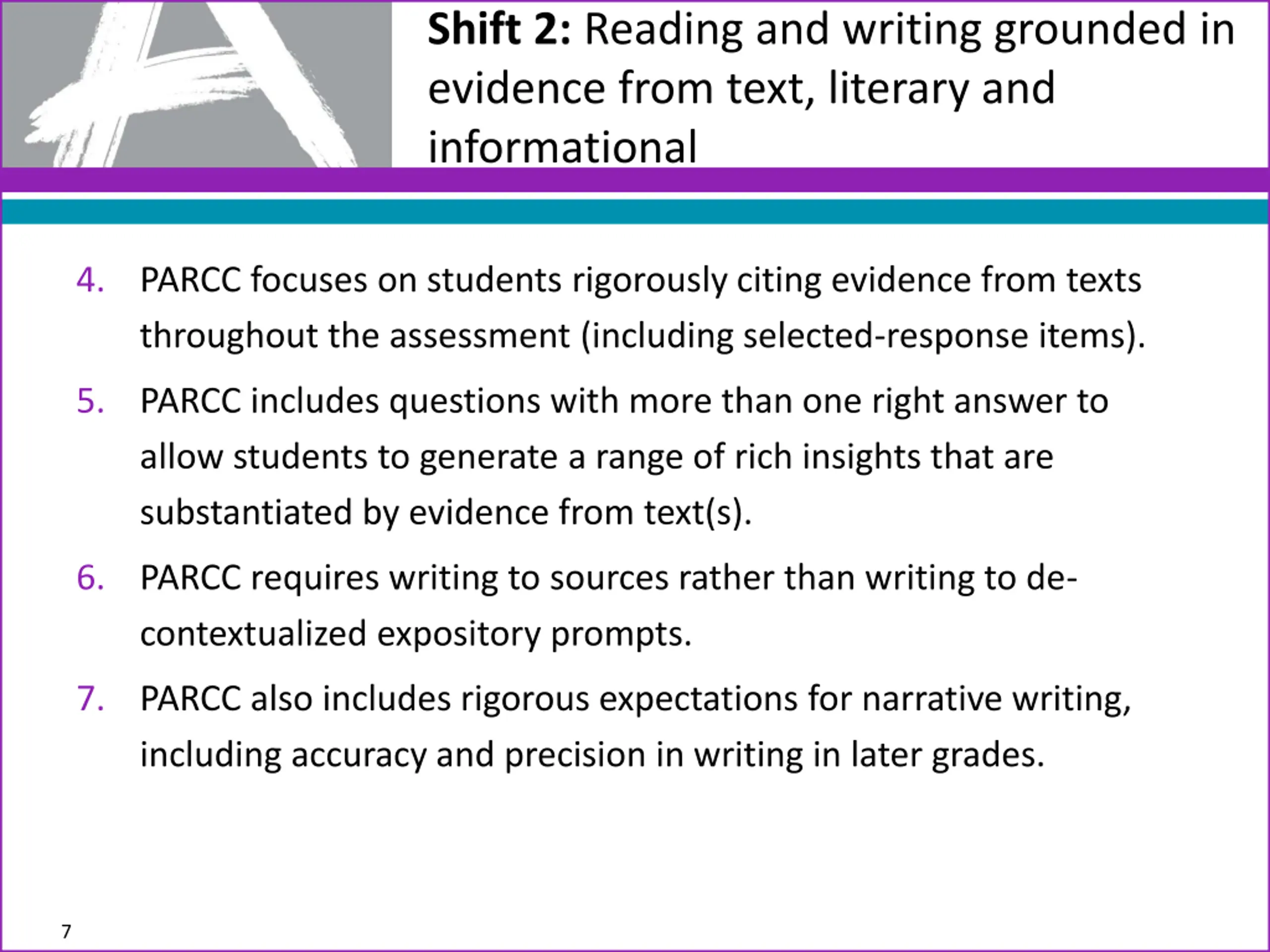 Shift 2: Reading and writing grounded in evidence from text, literary and informational 4. PARCC focuses on students rigorously citing evidence from texts throughout the assessment (including selected-response items). 5. PARCC includes questions with more than one right answer to allow students to generate a range of rich insights that are substantiated by evidence from text(s). 6. PARCC requires writing to sources rather than writing to de- contextualized expository prompts. 7. PARCC also includes rigorous expectations for narrative writing, including accuracy and precision in writing in later grades. 7
