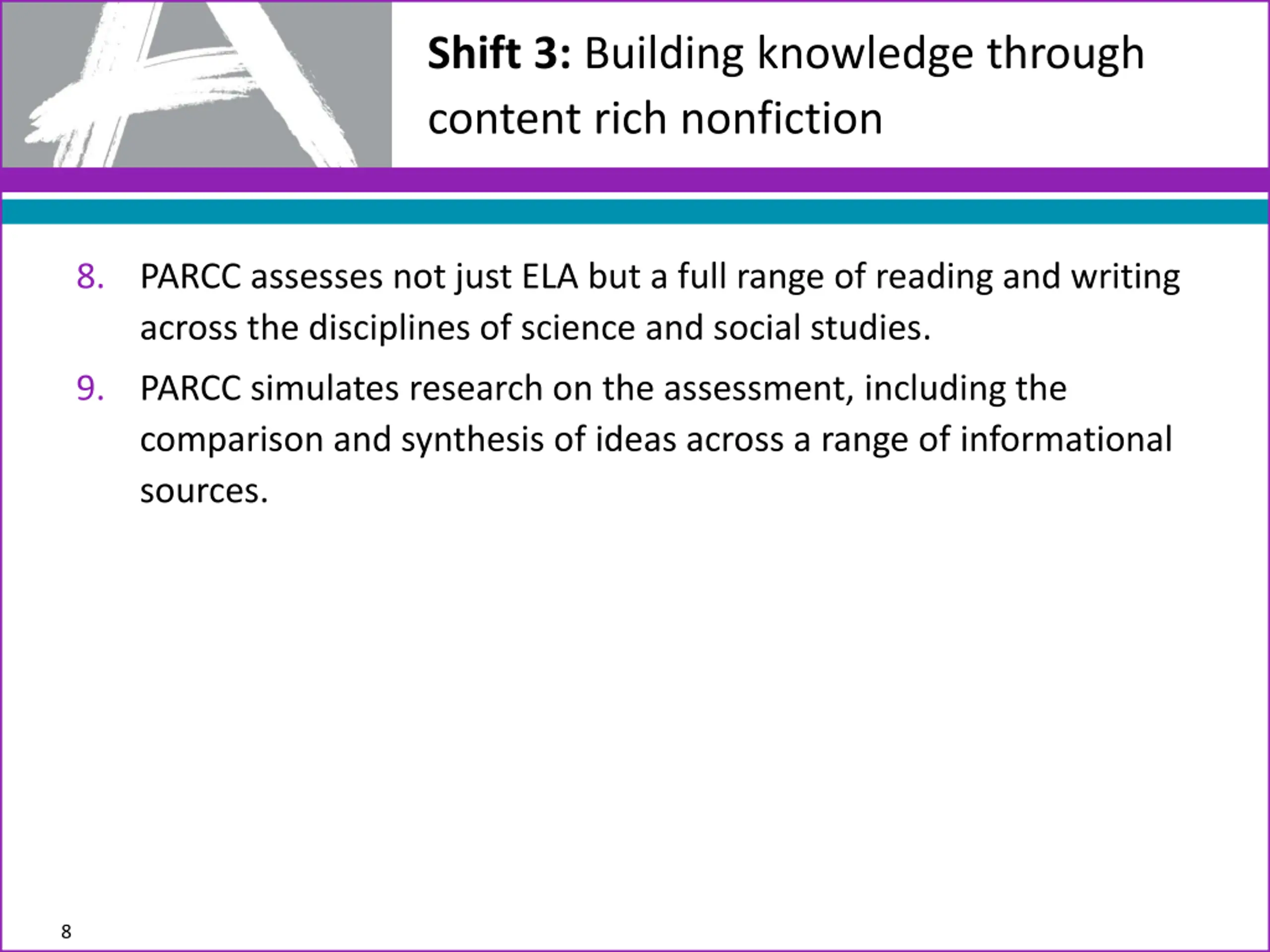 Shift 3: Building knowledge through content rich nonfiction 8. PARCC assesses not just ELA but a full range of reading and writing across the disciplines of science and social studies. 9. PARCC simulates research on the assessment, including the comparison and synthesis of ideas across a range of informational sources. 8