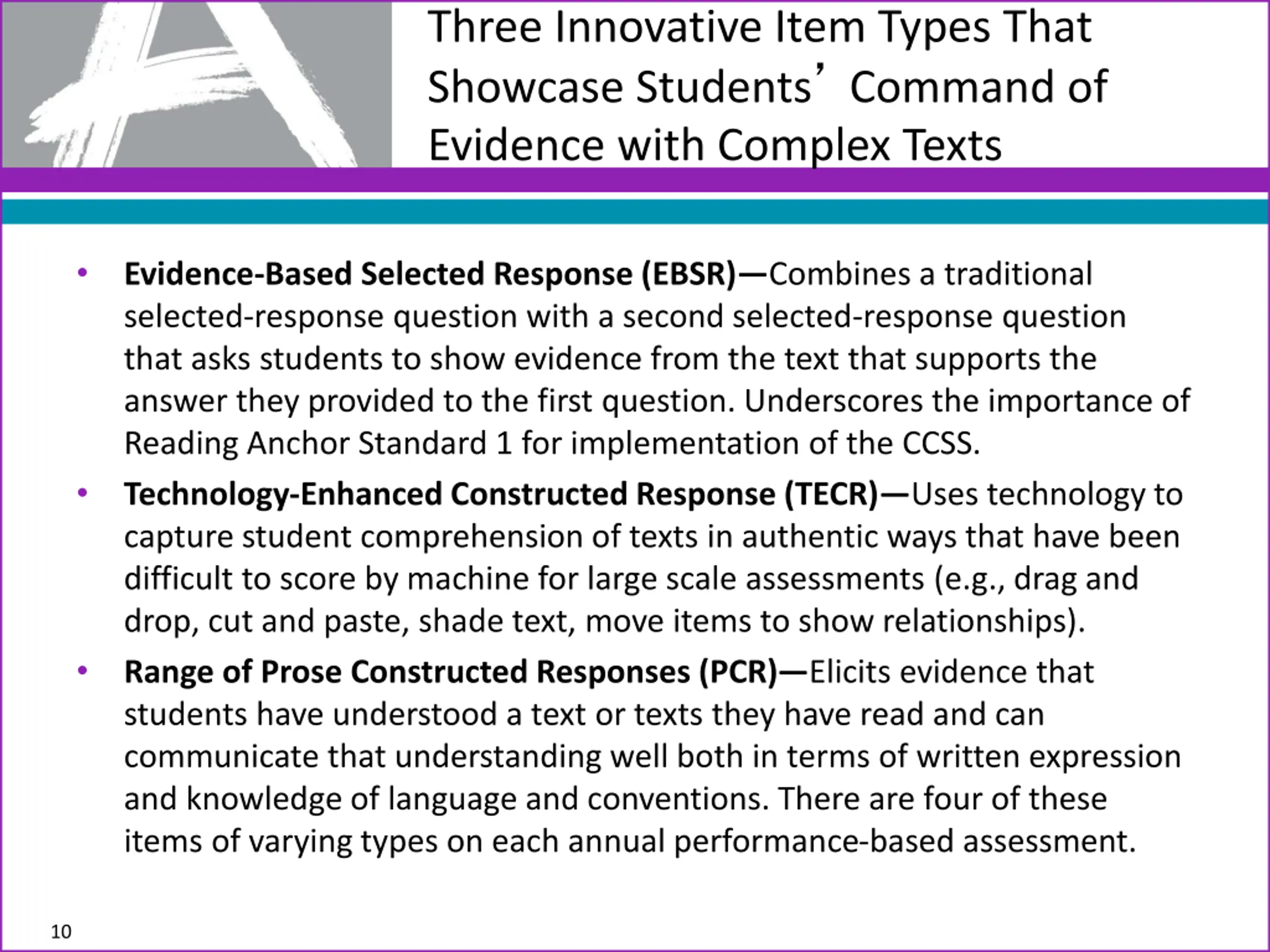 Three Innovative Item Types That Showcase Students’ Command of Evidence with Complex Texts • Evidence-Based Selected Response (EBSR)—Combines a traditional selected-response question with a second selected-response question that asks students to show evidence from the text that supports the answer they provided to the first question. Underscores the importance of Reading Anchor Standard 1 for implementation of the CCSS. Technology-Enhanced Constructed Response (TECR)—Uses technology to capture student comprehension of texts in authentic ways that have been difficult to score by machine for large scale assessments (e.g., drag and drop, cut and paste, shade text, move items to show relationships). Range of Prose Constructed Responses (PCR)—Elicits evidence that students have understood a text or texts they have read and can communicate that understanding well both in terms of written expression and knowledge of language and conventions. There are four of these items of varying types on each annual performance-based assessment. • • 10