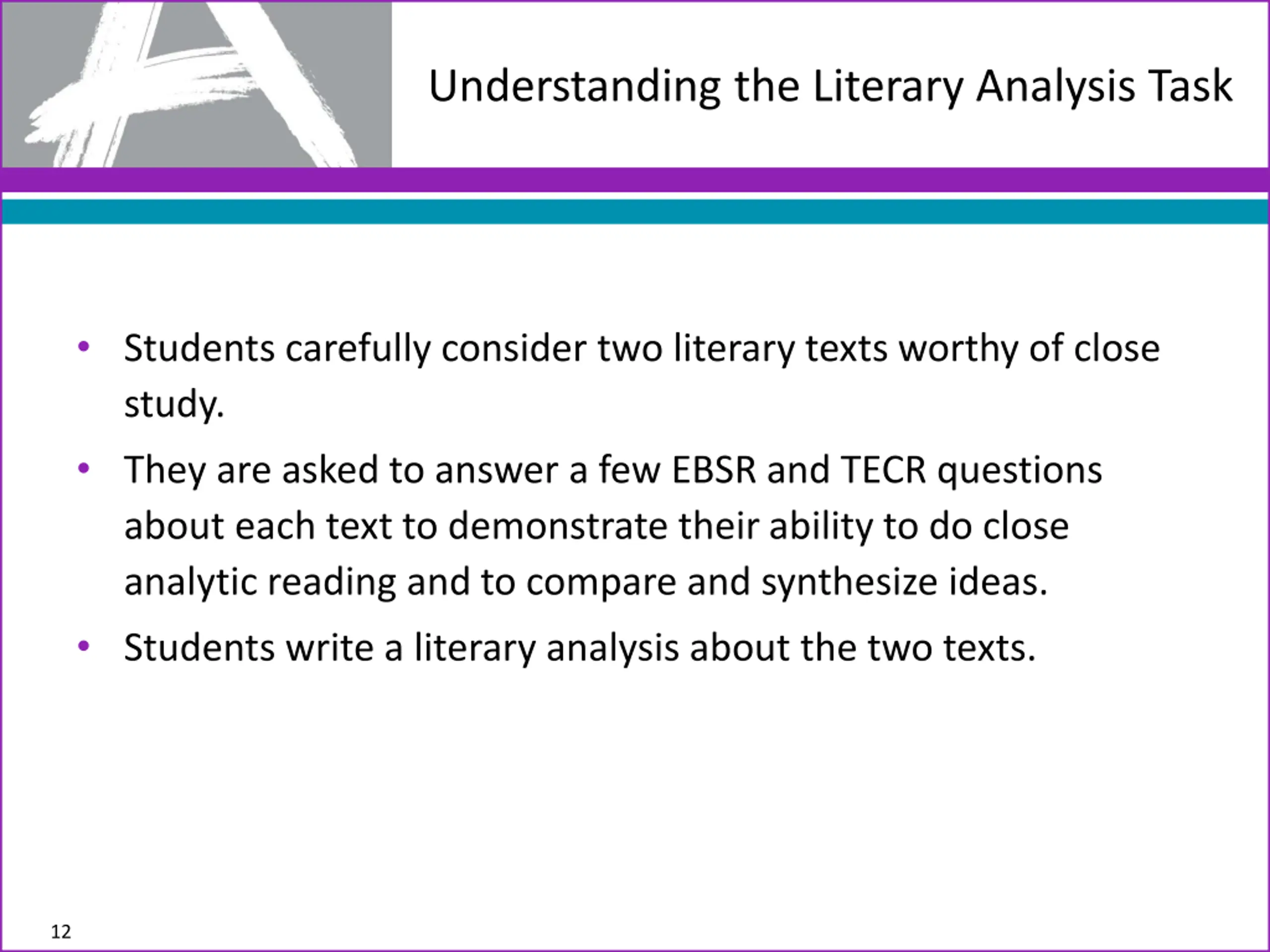 Understanding the Literary Analysis Task • Students carefully consider two literary texts worthy of close study. • They are asked to answer a few EBSR and TECR questions about each text to demonstrate their ability to do close analytic reading and to compare and synthesize ideas. • Students write a literary analysis about the two texts. 12