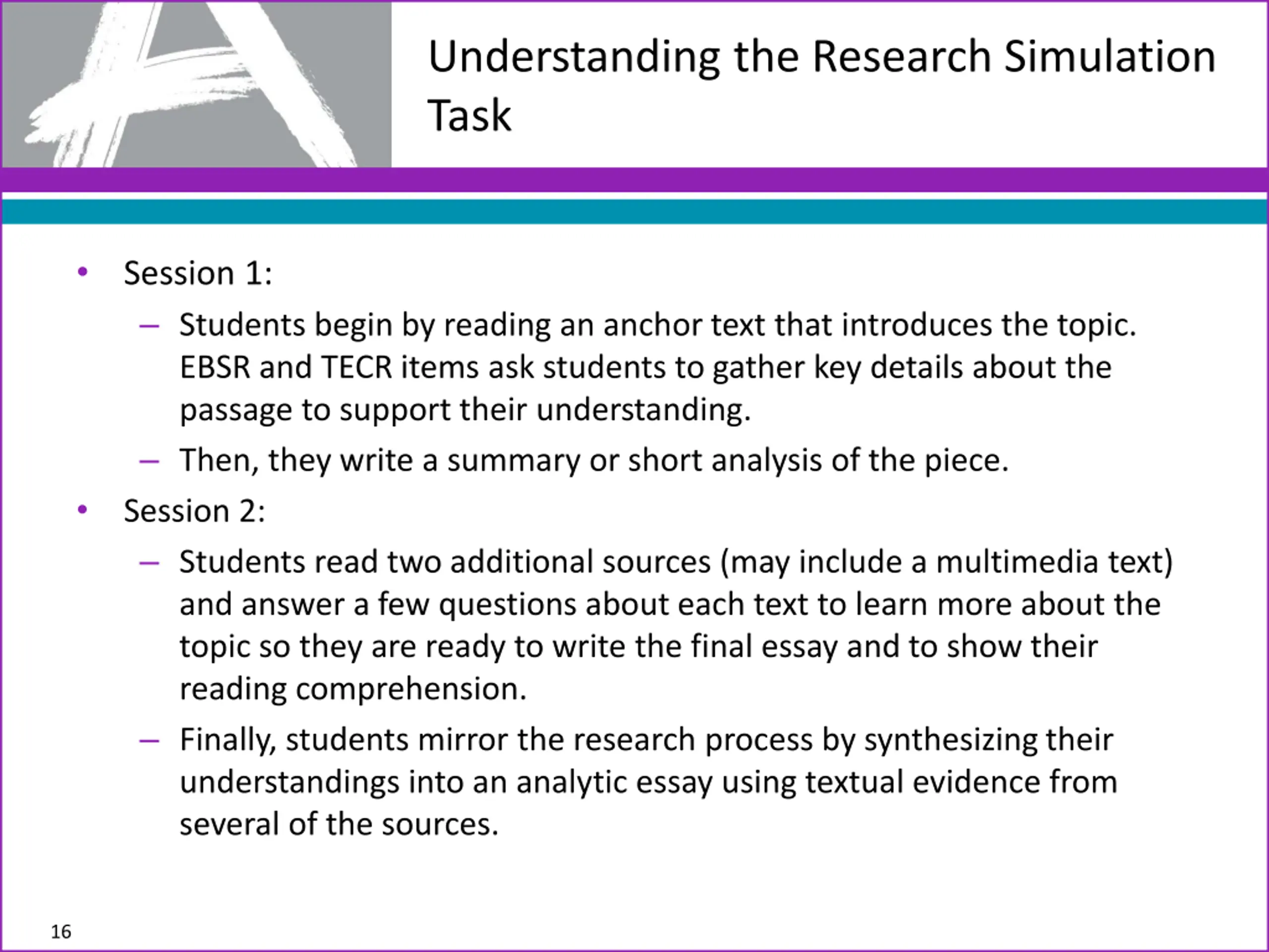 Understanding the Research Simulation Task • Session 1: – Students begin by reading an anchor text that introduces the topic. EBSR and TECR items ask students to gather key details about the passage to support their understanding. – Then, they write a summary or short analysis of the piece. Session 2: – Students read two additional sources (may include a multimedia text) and answer a few questions about each text to learn more about the topic so they are ready to write the final essay and to show their reading comprehension. – Finally, students mirror the research process by synthesizing their understandings into an analytic essay using textual evidence from several of the sources. • 16