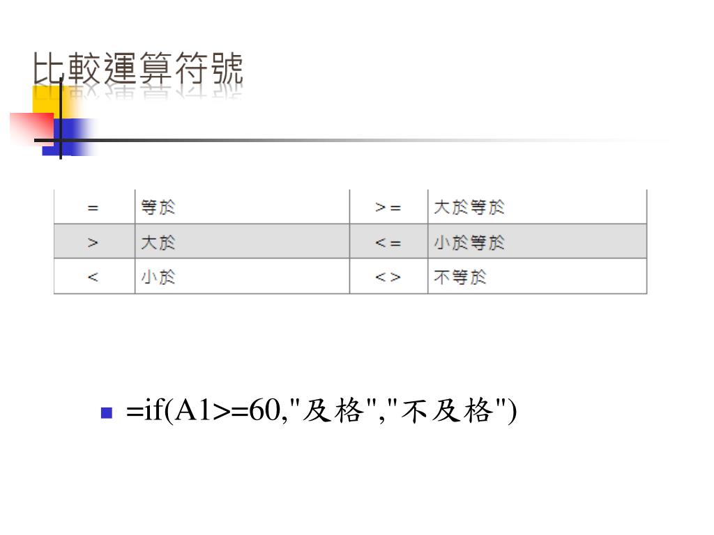 設定一般公式與函數 • 公式或函數都是以「=」(等號)作為開頭 • 要計算的對象稱之為「引數」可為 • 位址、名稱或常數等。設定「函數」時 • 可直接使用「插入函數」或自行輸入來完成 • 運算符號