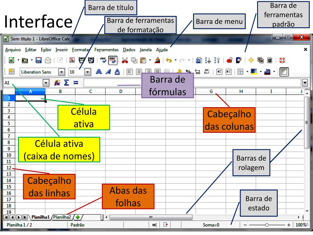Barra de título Barra de ferramentas padrão Interface Barra de menu Barra de ferramentas de formatação Barra de fórmulas Célula ativa Cabeçalho das colunas Célula ativa (caixa de nomes) Barras de rolagem Cabeçalho das linhas Abas das folhas Barra de estado