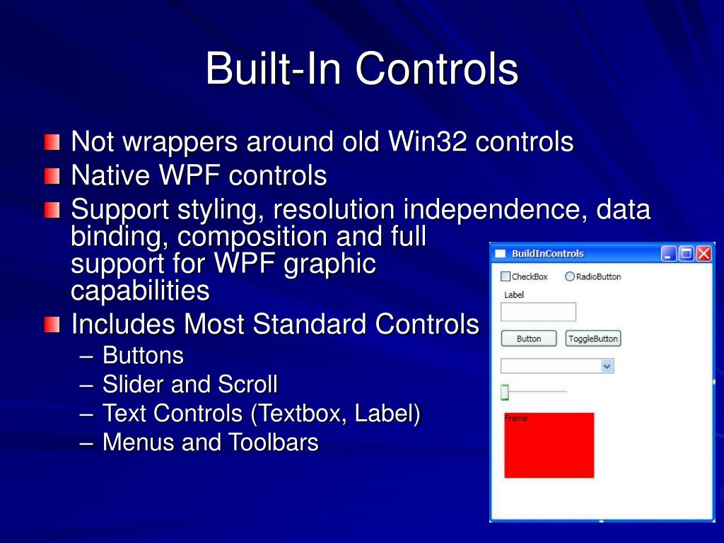 Built-In Controls • Not wrappers around old Win32 controls • Native WPF controls • Support styling, resolution independence, data binding, composition and full support for WPF graphic capabilities • Includes Most Standard Controls • Buttons • Slider and Scroll • Text Controls (Textbox, Label) • Menus and Toolbars